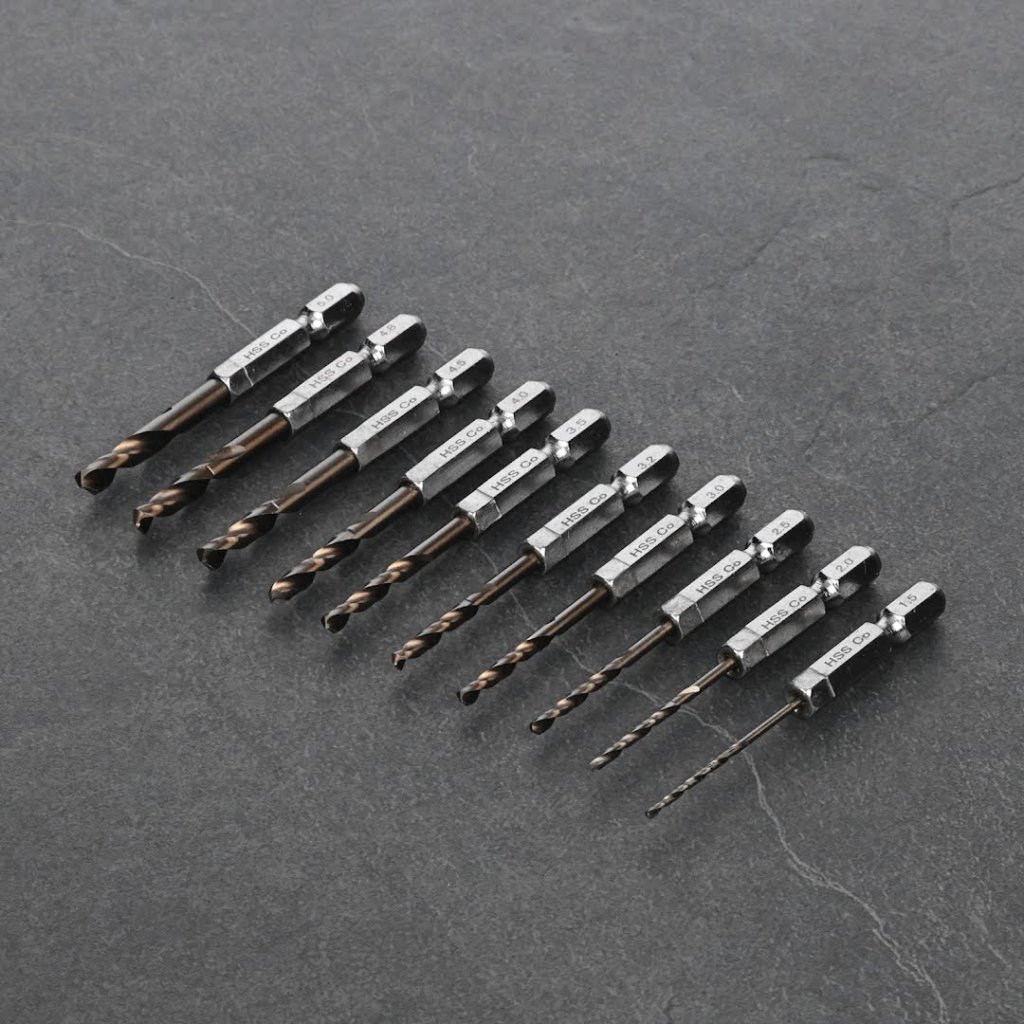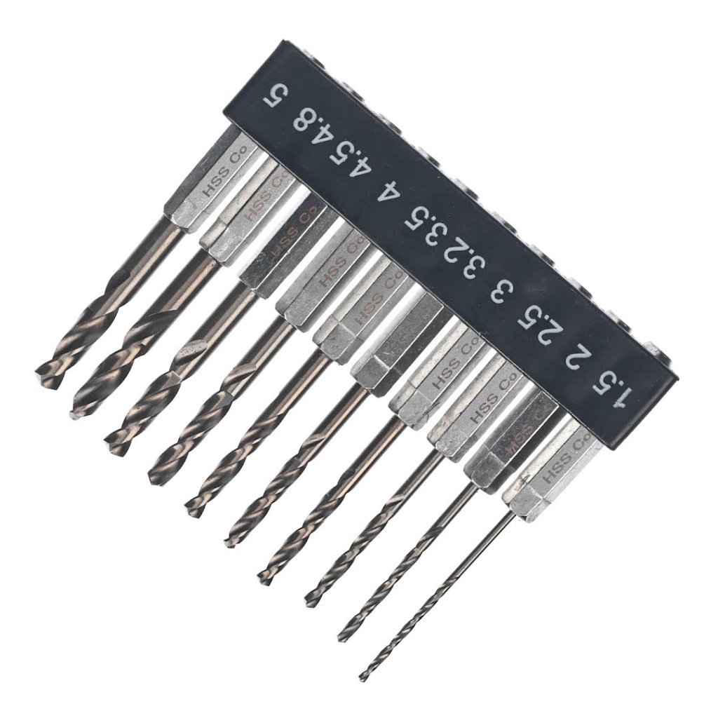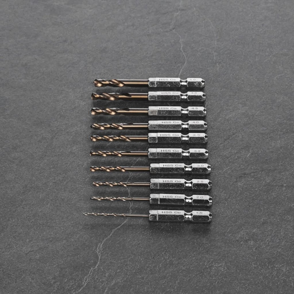 E-VALUE sada krátkých vrtáků, model ESSD-10HEX, je odborně navržena pro vrtání do železa, nerezové oceli, hliníku, pryskyřice a dřeva. Vyrobeno z kobaltové rychlořezné oceli, poskytuje zvýšenou tepelnou odolnost a trvanlivost. Tato sada obsahuje deset vrtáků v rozsahu od 1,5 mm do 5,0 mm, vybavených 6,35 mm šestihrannou stopkou, která snižuje prokluzování sklíčidla a zajišťuje kompatibilitu s rázovými utahováky. Ztenčený hrot zajišťuje vynikající přilnavost a minimalizuje prokluzování během používání.
