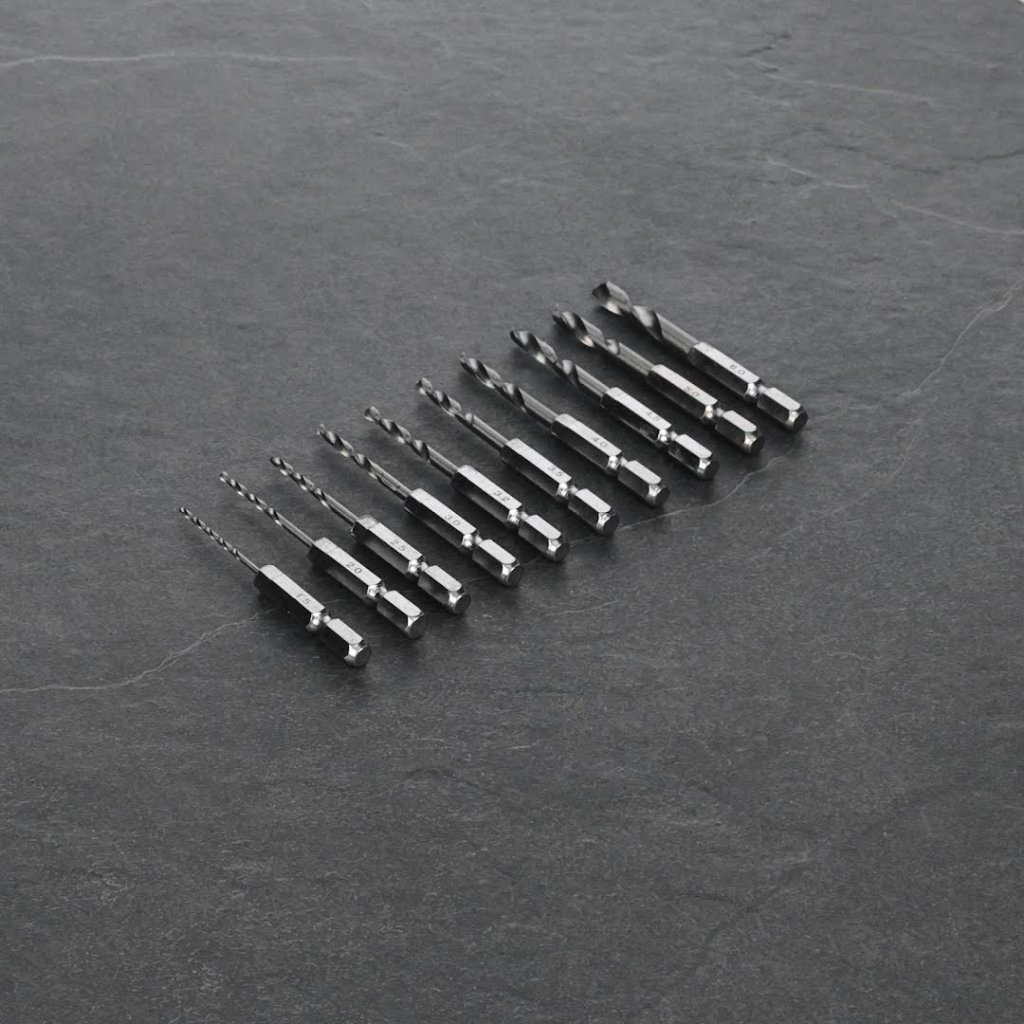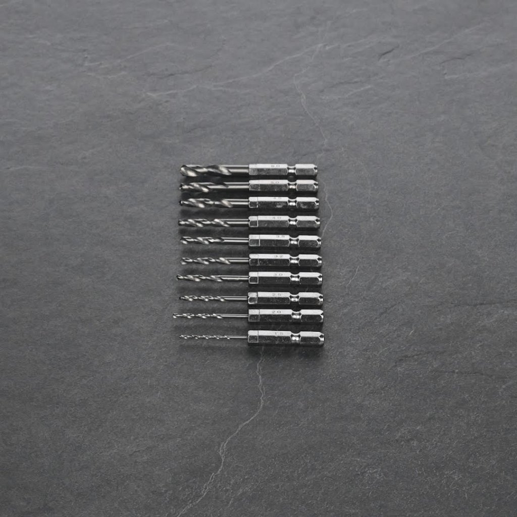 Sada E-VALUE, model ESTD-10HEX, je ideální pro vrtání děr do železa, hliníku, pryskyřice a dřeva. Sada obsahuje deset kusů v rozmezí od 1,5 mm do 6,0 mm. Každý vrták má 6,35 mm šestihrannou stopku pro bezpečné uchycení a kompatibilitu s rázovými šroubováky. Řezné hrany procházejí procesem ztenčování, což zajišťuje vynikající záběr materiálu a snížení sklouznutí.
