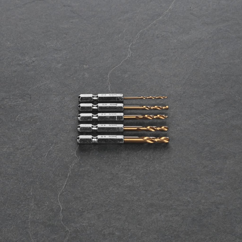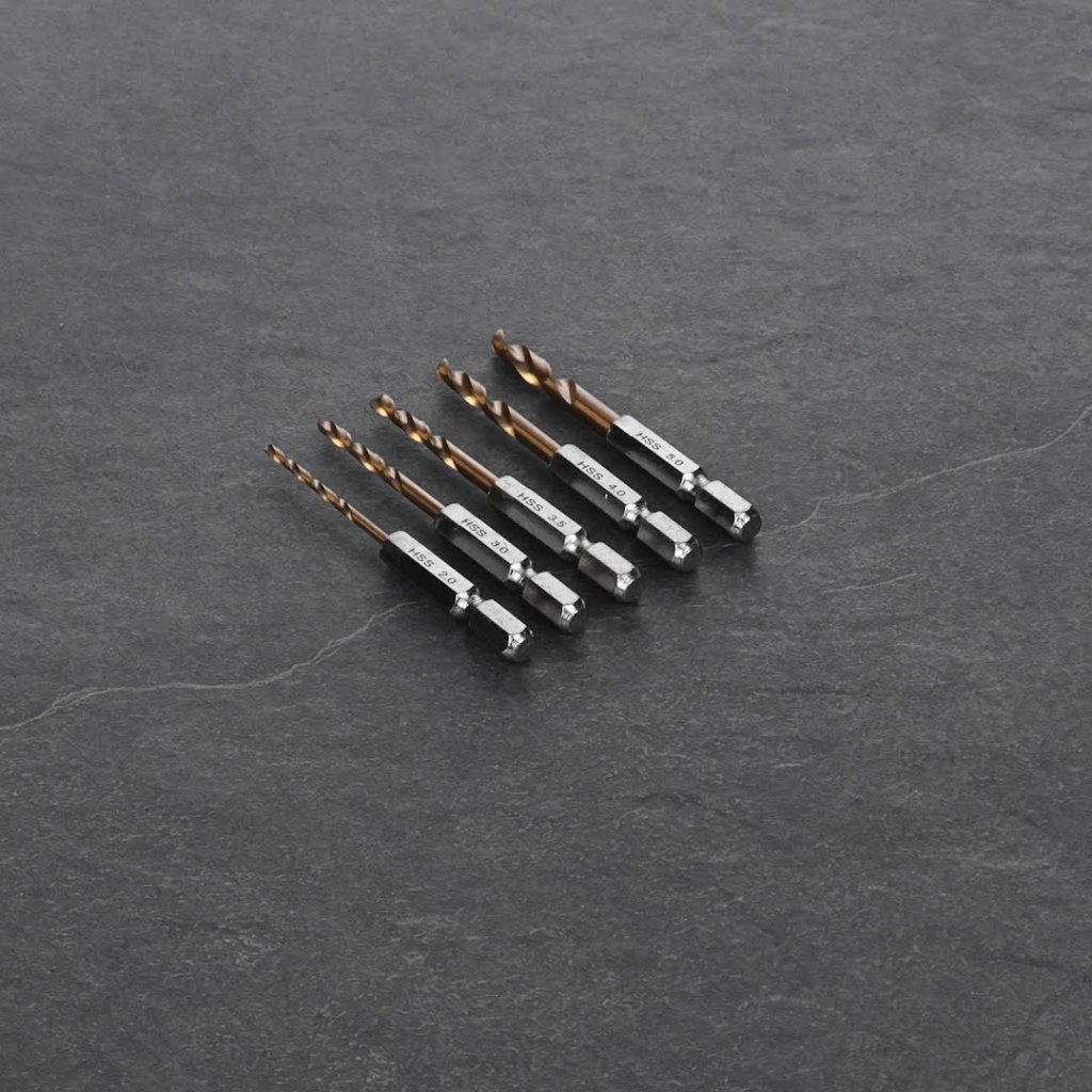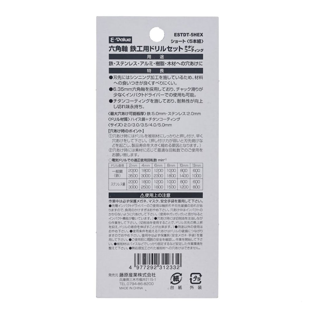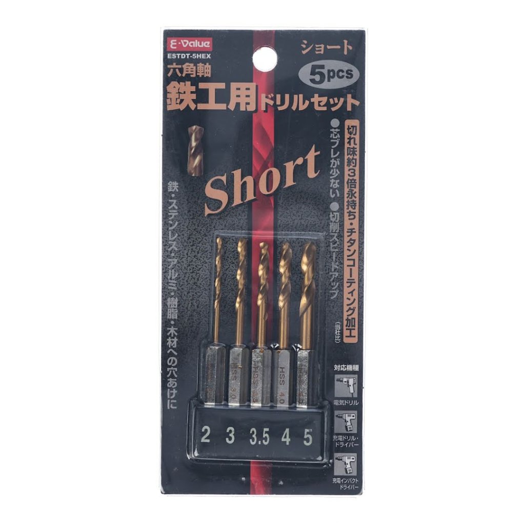 E-VALUE 5 dílná sada kovových vrtáků s povlakem TiN, model ESTDT-5HEX, obsahuje titanový povlak pro zvýšenou odolnost a životnost. Tyto vrtáky jsou navrženy pro vrtání do železa, nerezové oceli, hliníku, plastu a dřeva. Sada obsahuje pět vrtáků o velikostech 2,0, 3,0, 3,5, 4,0 a 5,0 mm, s 6,35 mm šestihrannou stopkou, která snižuje prokluz ve sklíčidle a je kompatibilní s rázovými utahováky. Ředící proces na řezných hranách zajišťuje pevné uchopení materiálů, čímž zabraňuje prokluzu.