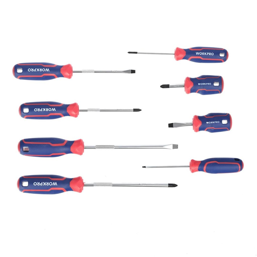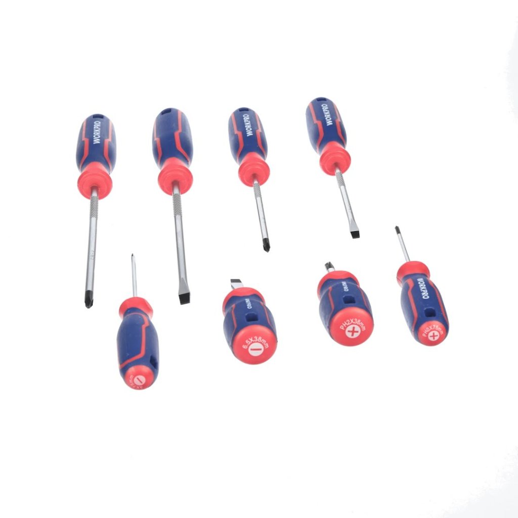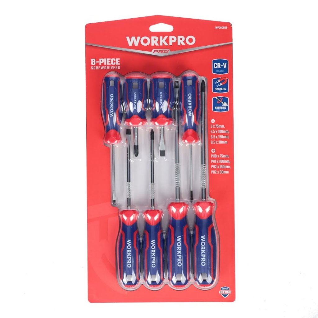 Sada šroubováků od WORKPRO je všestranná sada určená pro každou vaši potřebu v oblasti šroubování, ať už křížových nebo plochých šroubů. V sadě najdete 4 ploché a 4 křížové šroubováky různých velikostí, tak aby pokryly širokou škálu velikostí šroubů.