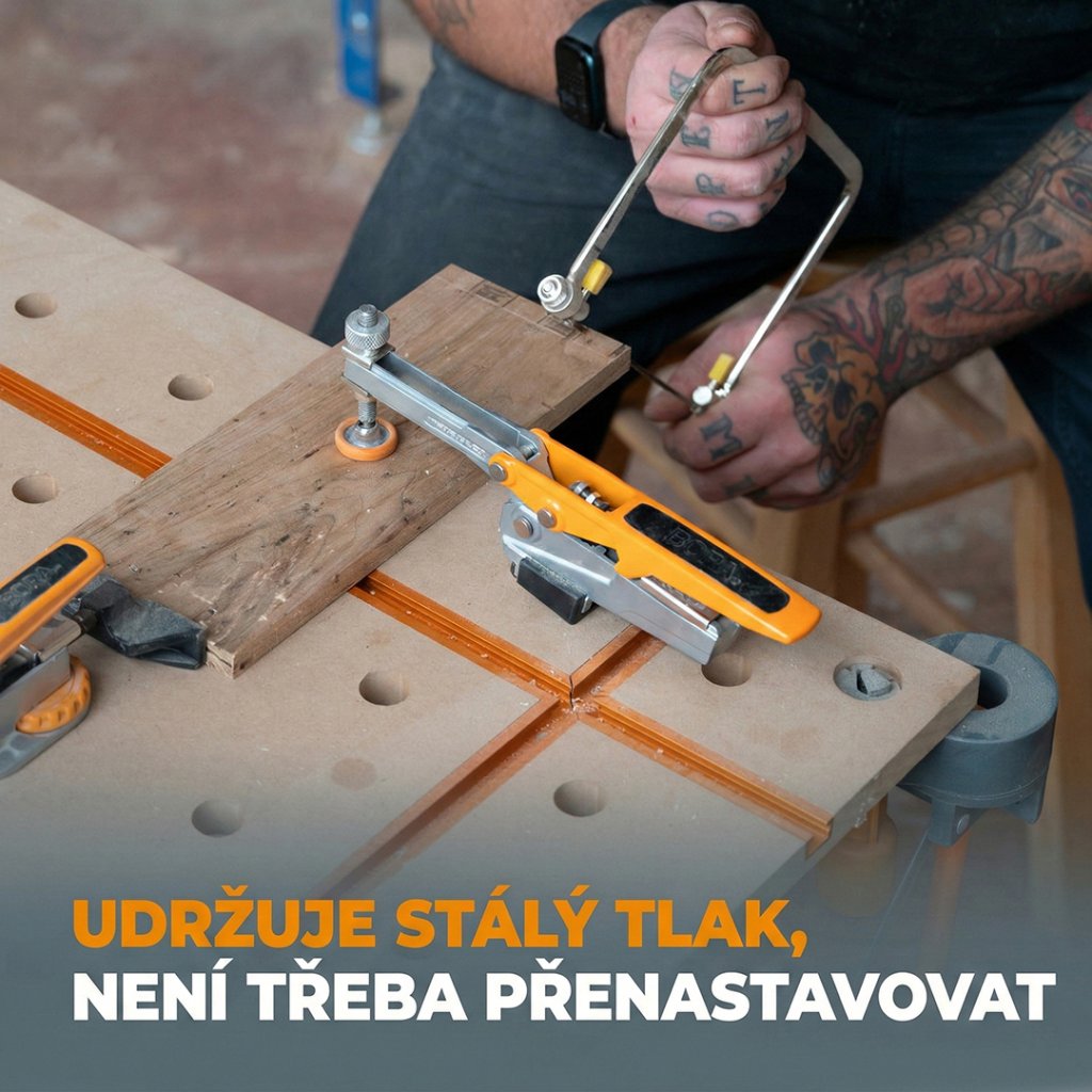 Nastavitelná zápustková svorka od firmy KREG® vyvíjí tlak ze strany zpracovávaného materiálu. Upínací síla činí 113 Kg.