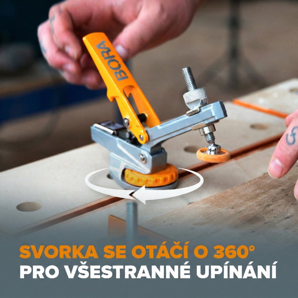 Horizontální svěrka BORA s automatickým nastavením T-drážky je nezbytným nástrojem pro profesionály, kteří chtějí zvýšit svou efektivitu a pohodlí při práci s materiály různé tloušťky. Tato inovativní svěrka je navržena pro snadné použití na jakémkoli projektu, který využívá standardní T-drážku 5/16 palce, čímž eliminuje neustálou potřebu nastavování a udržuje konzistentní tlak. Díky možnosti otáčení o 360 stupňů nabízí tato svěrka všestrannost, díky čemuž je ideální pro jakékoli pracovní prostředí nebo projekt.