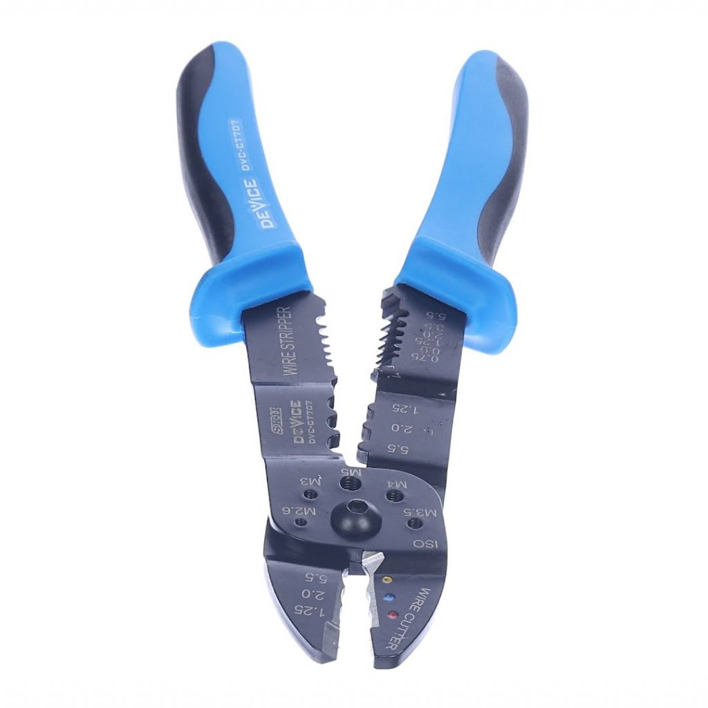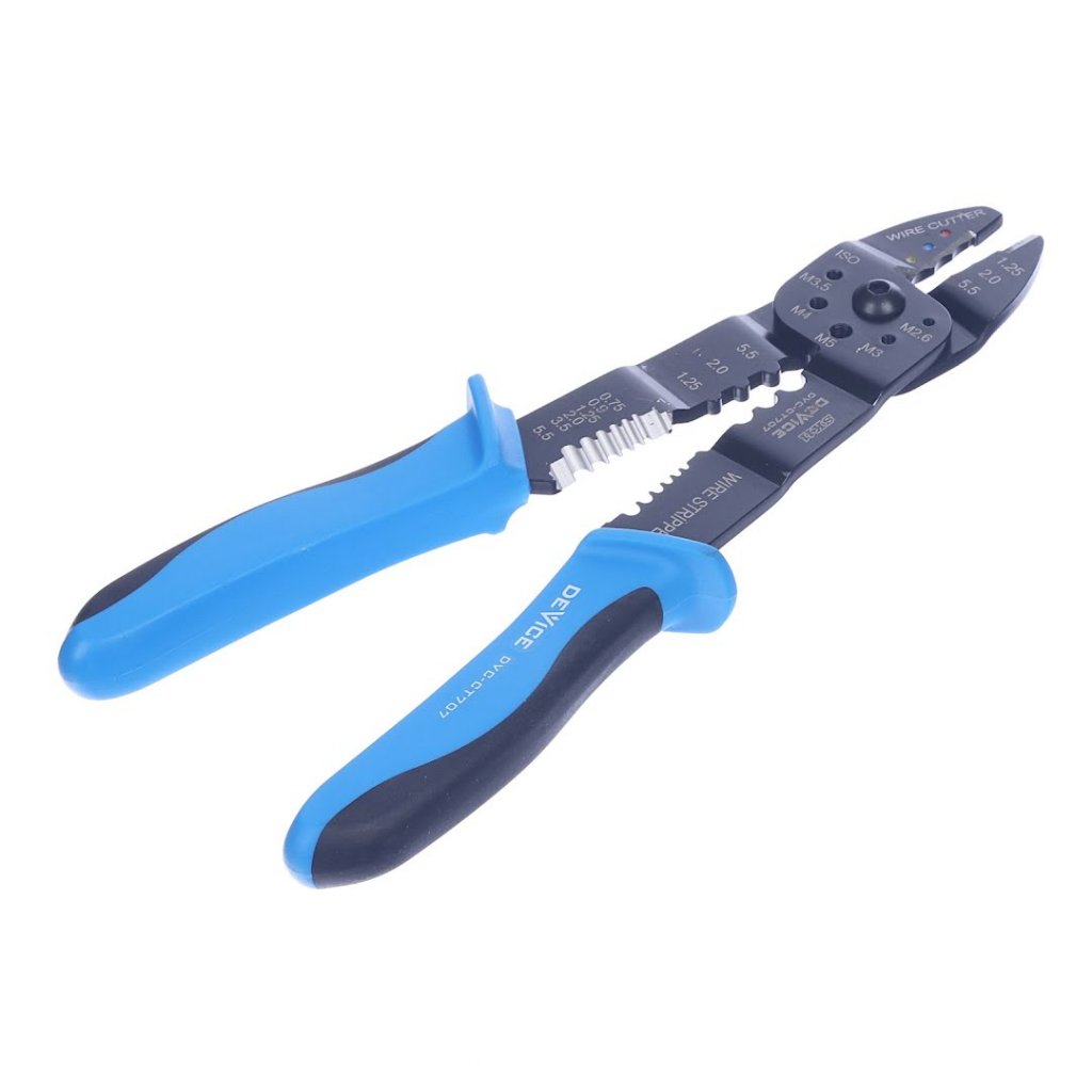 Krimpovací kleště DEVICE, model DVC-CT707, jsou všestranné elektrikářské kleště určené pro automobilové elektroinstalace a různé elektrikářské práce. Disponují přesným designem párovací čepele, pro přesné a spolehlivé řezání pláště drátu a snadné odizolování. Ergonomický úchop z elastomerové pryskyřice poskytuje pohodlí a odolnost proti skluzu, což snižuje únavu rukou při nepřetržitém používání. Schopné krimpovat holé a izolované dráty, obsahují také ostrou, leštěnou čepel pro řezání drátů a hliníkových linek a střihač šroubů pro velikosti M2.6 až M5. Díky specifikacím, které umožňují práci s širokou škálou velikostí drátů pro odizolování a krimpování, jsou ideálním nástrojem pro profesionální i hobby elektrikáře.