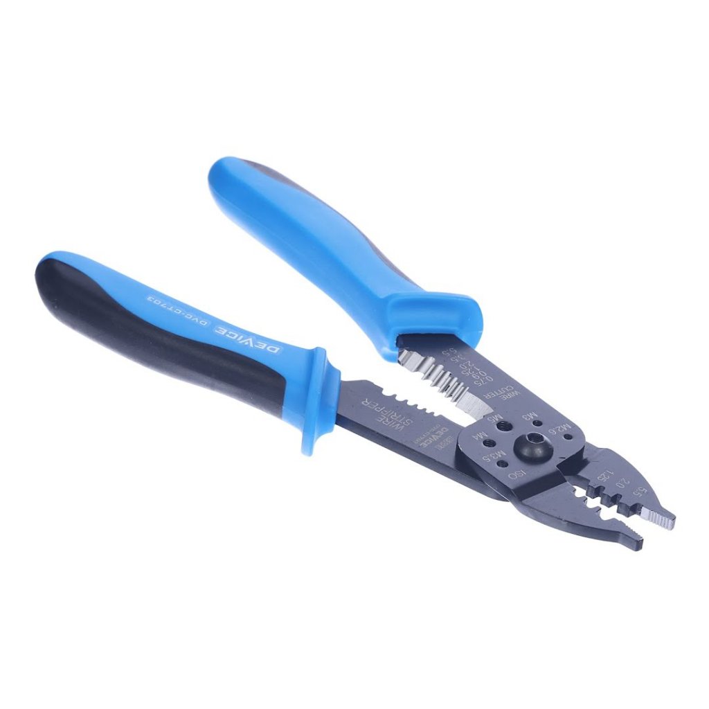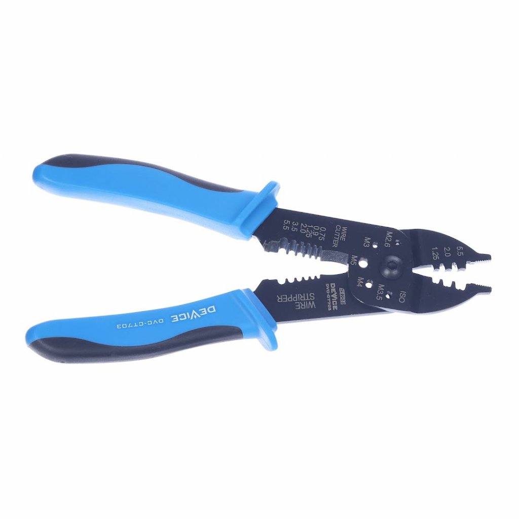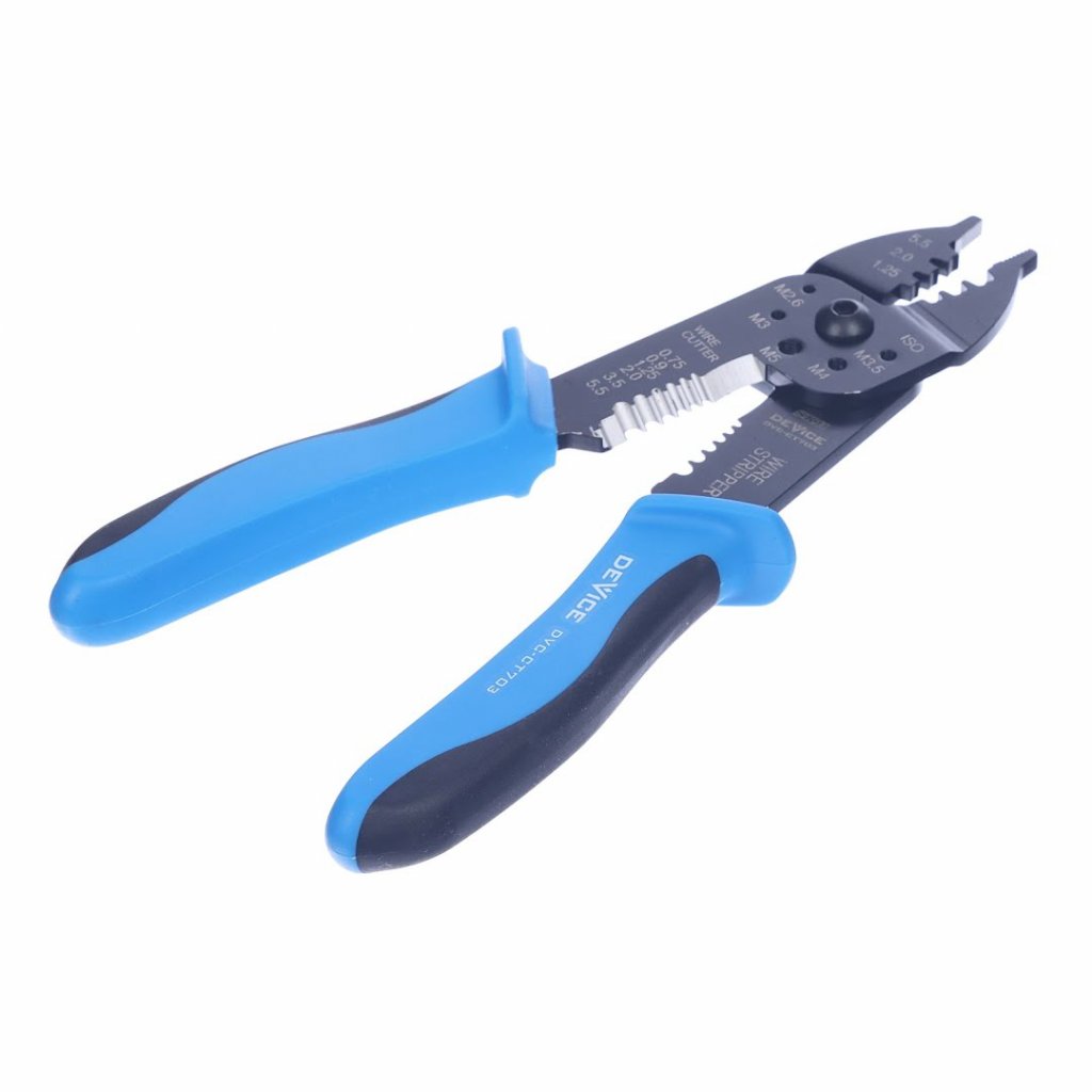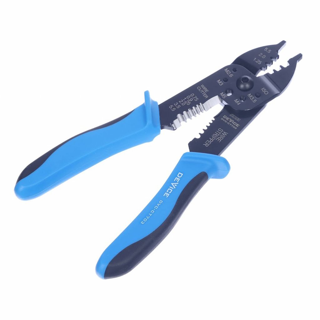 DEVICE krimpovací kleště s ergonomickou rukojetí, model DVC-CT703, jsou univerzální elektrikářské kleště pro elektroinstalační úkoly v automobilovém průmyslu a různých projektech. Nabízí přizpůsobený design čepelí pro přesné a snadné odizolování a řezání izolace vodičů. Elastomerová pryskyřicová rukojeť zajišťuje pohodlný, protiskluzový úchop pro dlouhodobé použití bez únavy rukou. Tento nástroj může krimpovat otevřené válcové svorky a obsahuje řezačku vodičů pro jemné a hliníkové vodiče. Jeho specifikace zahrnují krimpovací velikosti pro 1,25, 2,0 a 5,5 mm2, velikosti pro řezání šroubů od M2,6 do M5 a odizolovací velikosti pro lanové vodiče od 0,75 do 5,5 mm2, což z něj činí všestranný doplněk každé sady nářadí.