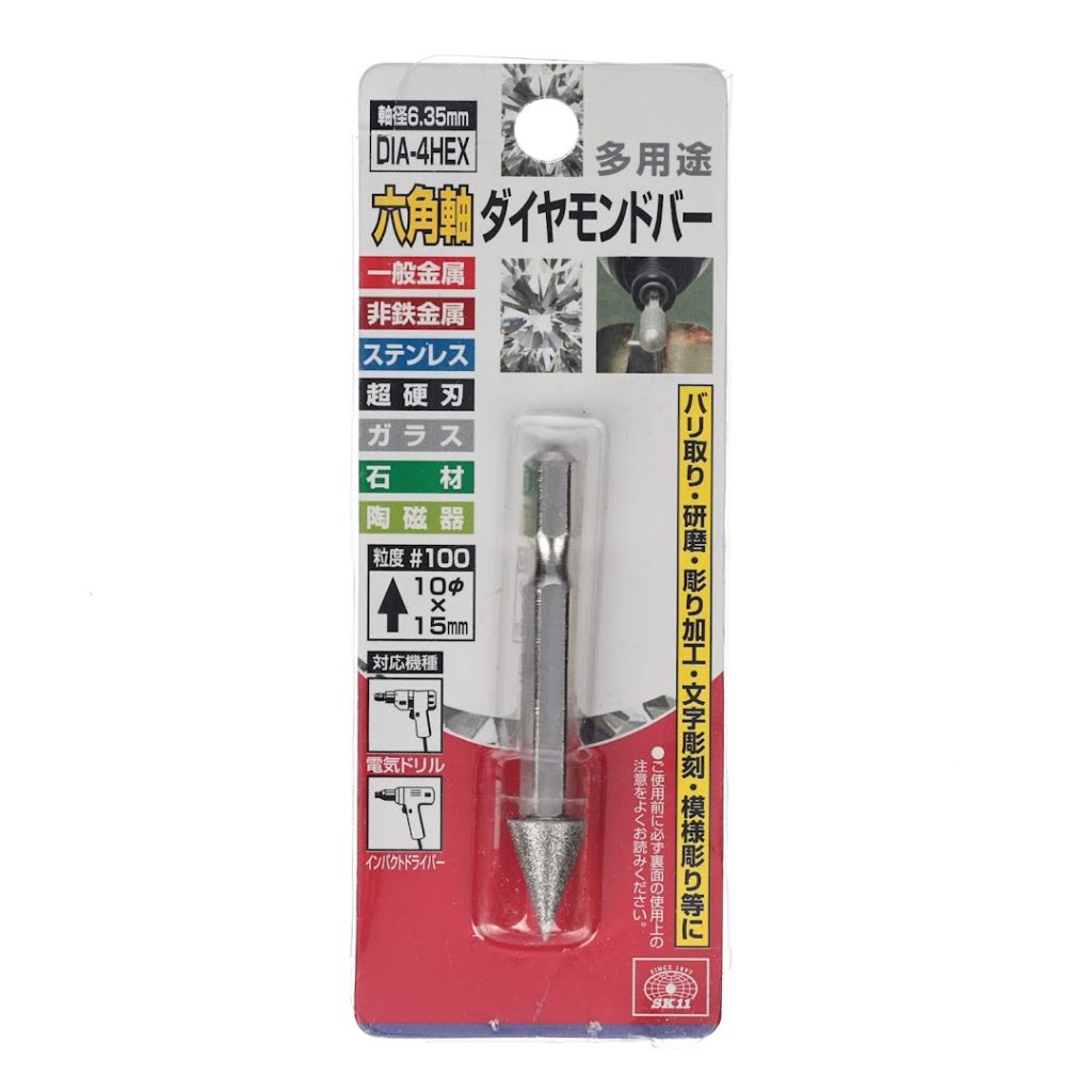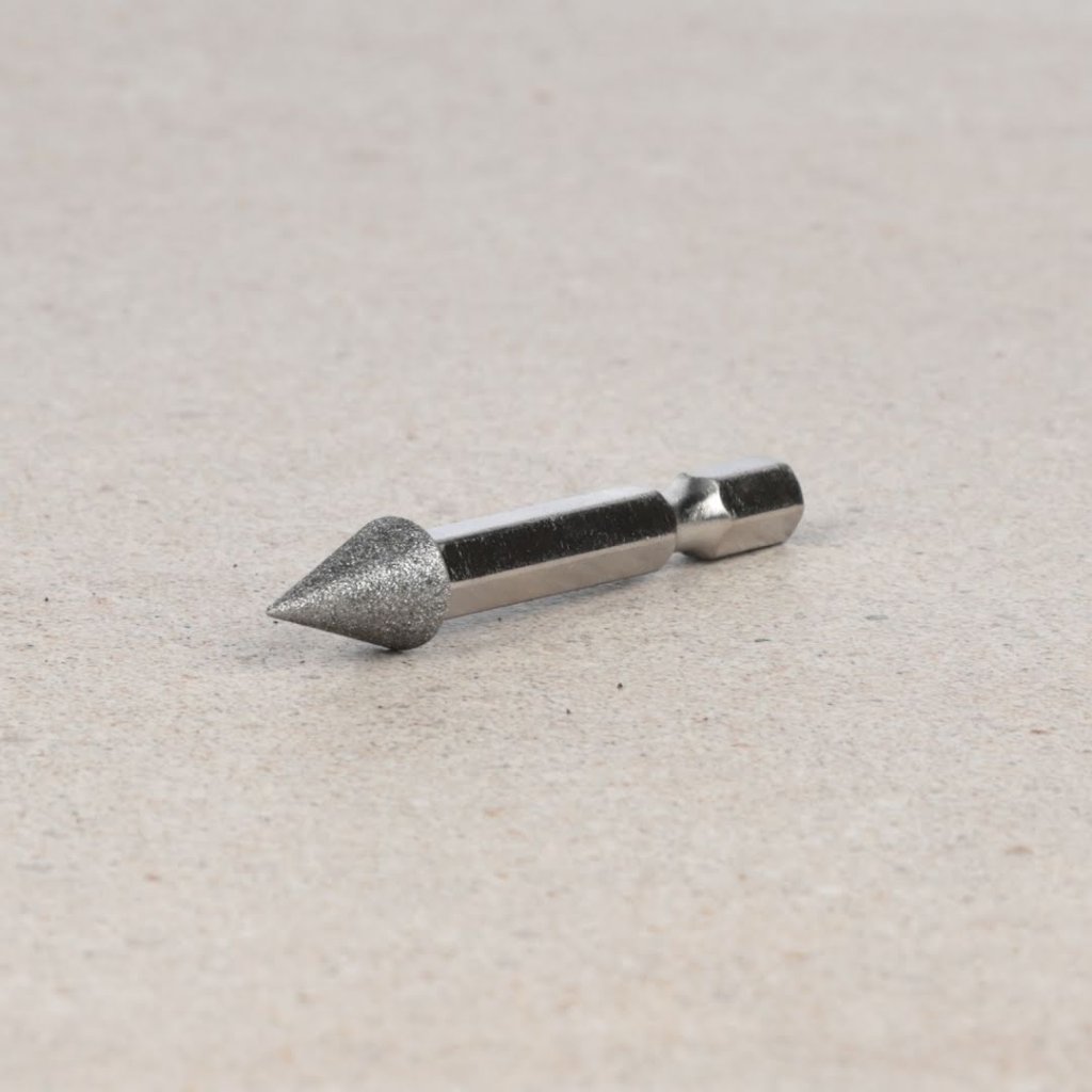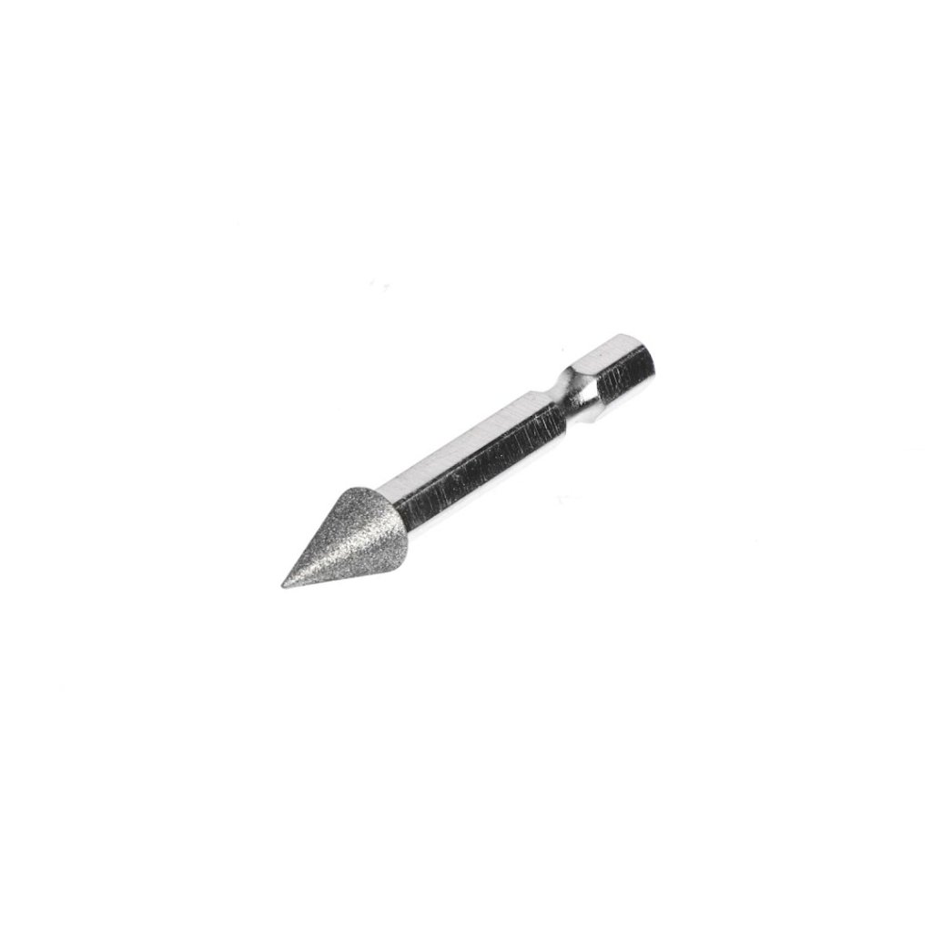 Diamantová rotační fréza SK11, DIA-4HEX, je navržena pro broušení a odstraňování otřepů z různých materiálů, včetně železa, nerezové oceli, karbidových čepelí, skla, kamene a keramiky. Díky 6,35 mm šestihranné stopce je kompatibilní s rázovými utahováky. Pilník má zrnitost #100 a špičatý kónický tvar o délce 15 mm a šířce 10 mm.