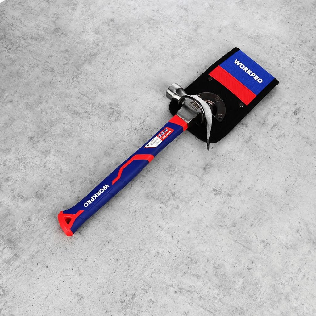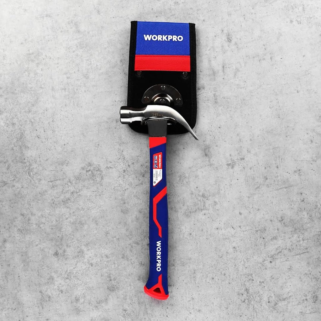 Držák na kladivo WORKPRO z pevného nylonu s flexibilním kovovým očkem k zavěšení kladiva.