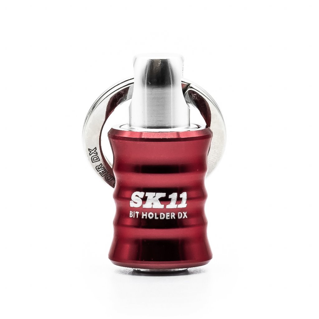 Hliníkový držák na bity s oválným upínacím otvorem o průměru 6.35 mm od značky SK11. Držák je vybaven upínacím zámkem k zajištění bitu proti uvolnění a kroužkem na klíče o průměru 21 mm.