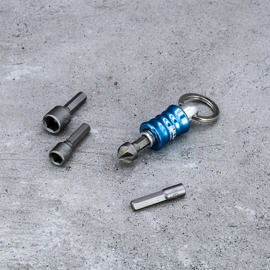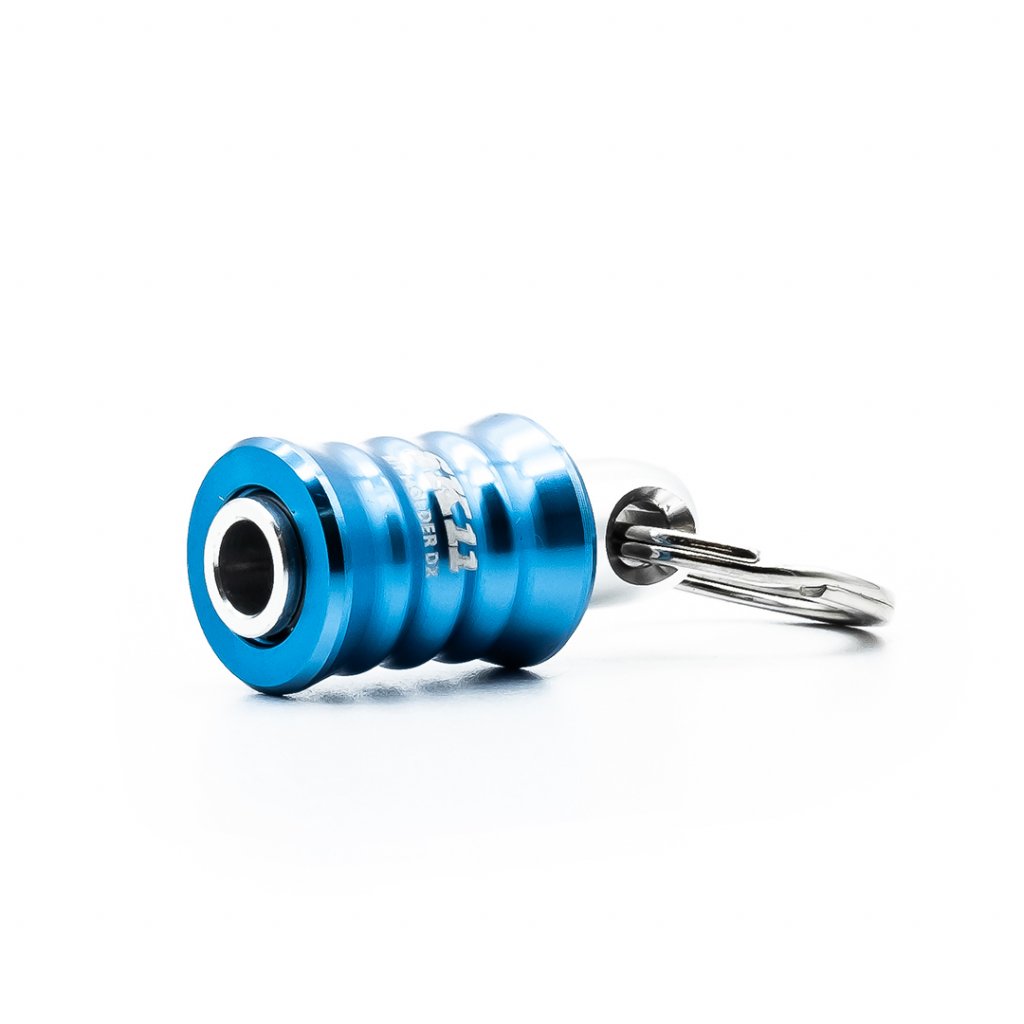 Hliníkový držák na bity s oválným upínacím otvorem o průměru 6.35 mm od značky SK11. Držák je vybaven upínacím zámkem k zajištění bitu proti uvolnění a kroužkem na klíče o průměru 21 mm.
