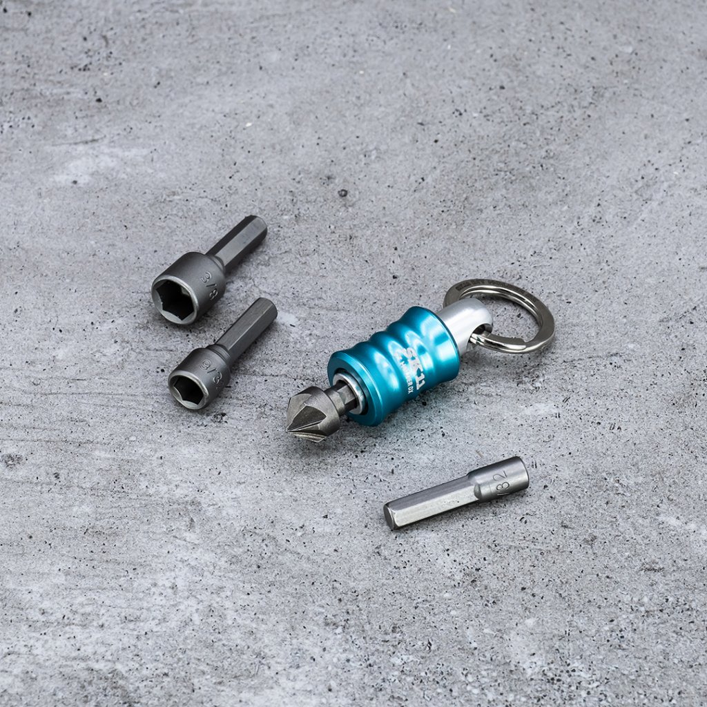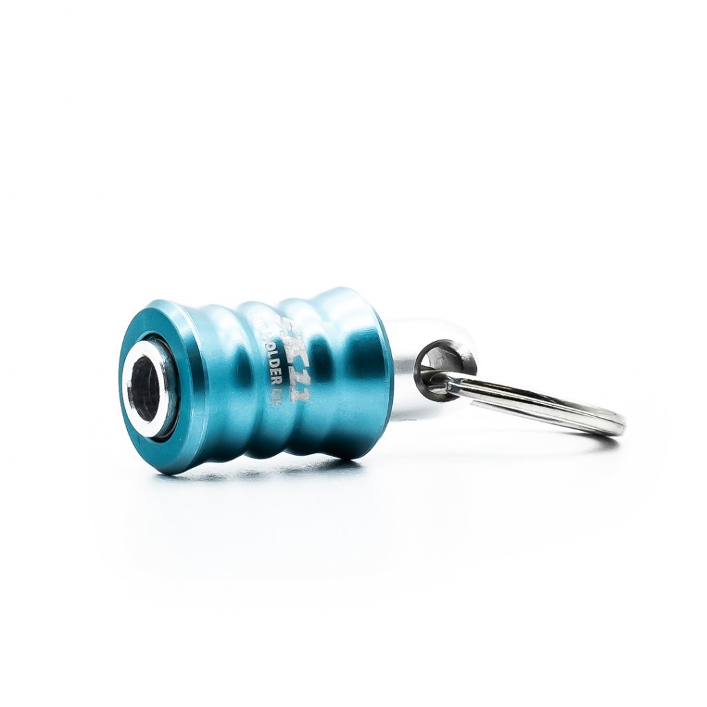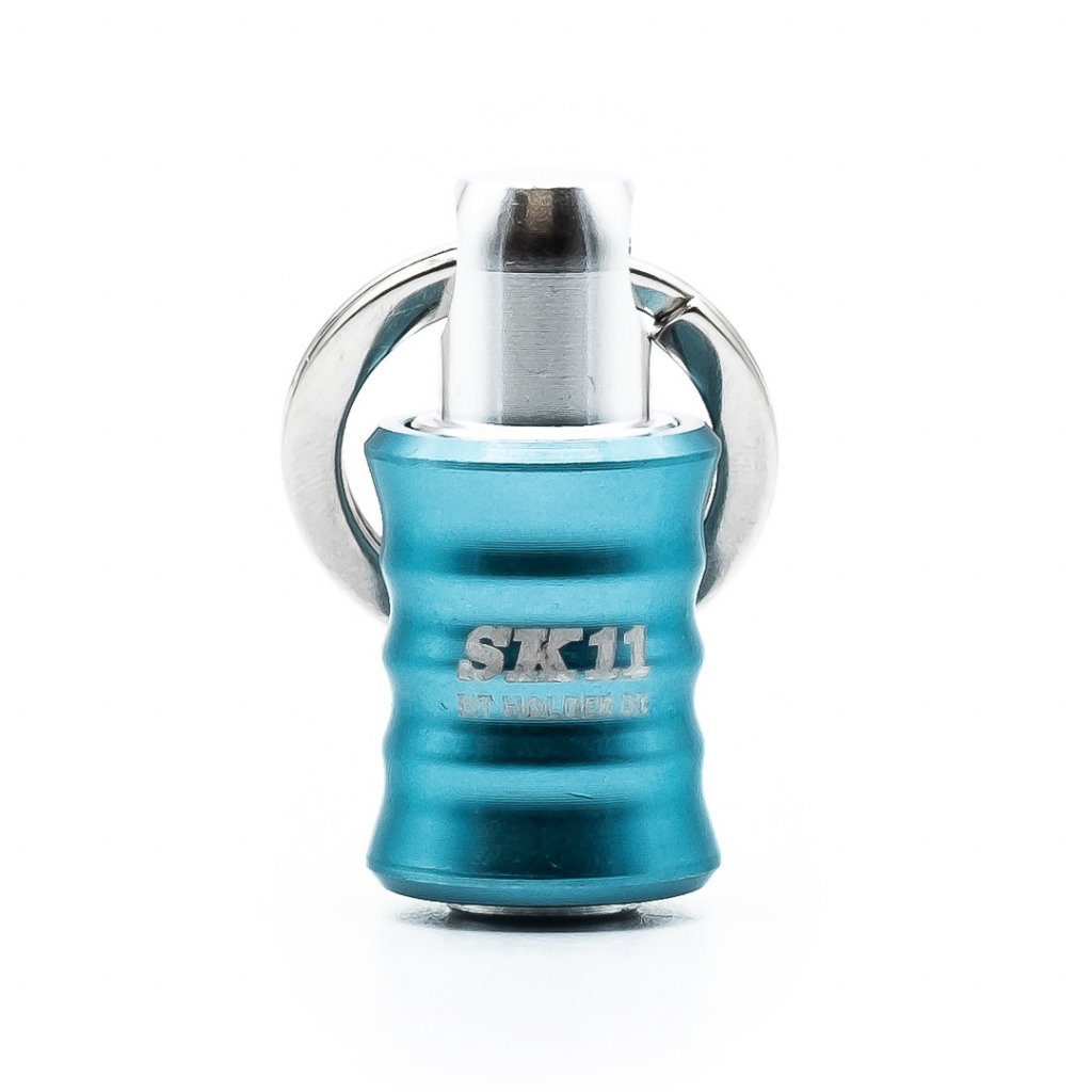 Hliníkový držák na bity s oválným upínacím otvorem o průměru 6.35 mm od značky SK11. Držák je vybaven upínacím zámkem k zajištění bitu proti uvolnění a kroužkem na klíče o průměru 21 mm.