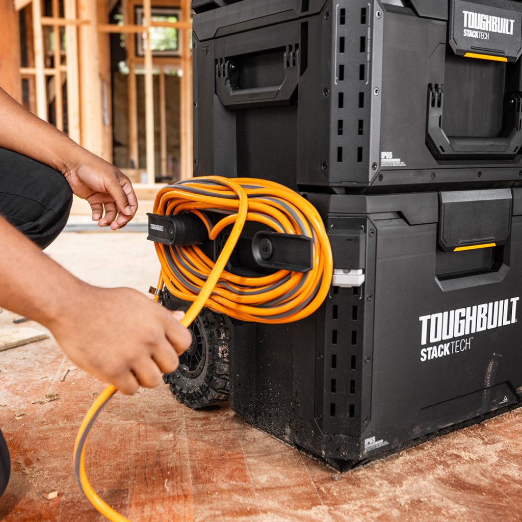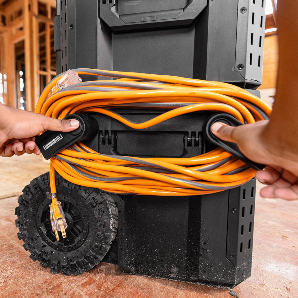 Dvoudílný organizér na kabely TOUGHBUILT® StackTech Cord Wrap umožňuje připevnění na boční přední stranu boxů systému StackTech tak, aby vyhovovala různým tloušťkám a délkám prodlužovacích kabelů. Otočná ramena umožňují snadné vyjmutí kabelu. Pojme až 30 m kabelu.