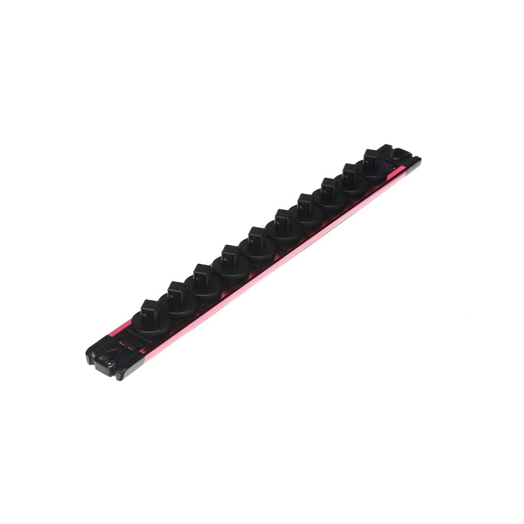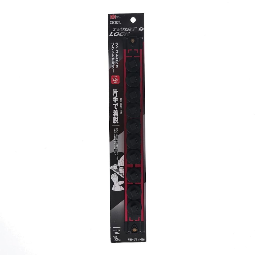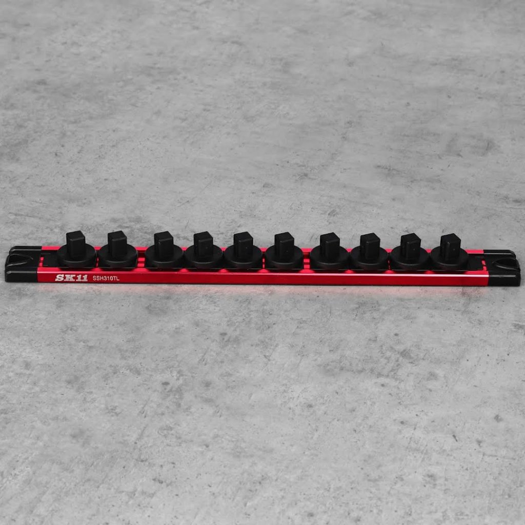 Držák nástrčných hlavic SK11, model SSH310TL, nabízí pohodlnou manipulaci jednou rukou pro připojení a odpojení klíčů. Jeho rozměry 30 x 300 x 26 mm a silný zadní magnet umožňují snadné připevnění k nástrojovým kufříkům. Ořechy můžete zajistit nebo uvolnit jednoduchým otočením přibližně o 20 stupňů. Slouží také jako stojan na klíče, což je ideální pro organizaci, ukládání a přenášení hlavic. Obsahuje deset klipů a velikost pohonu 9,5 mm.