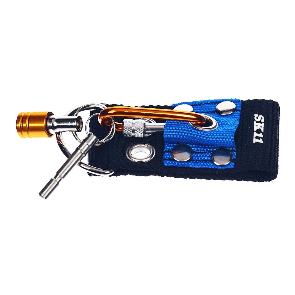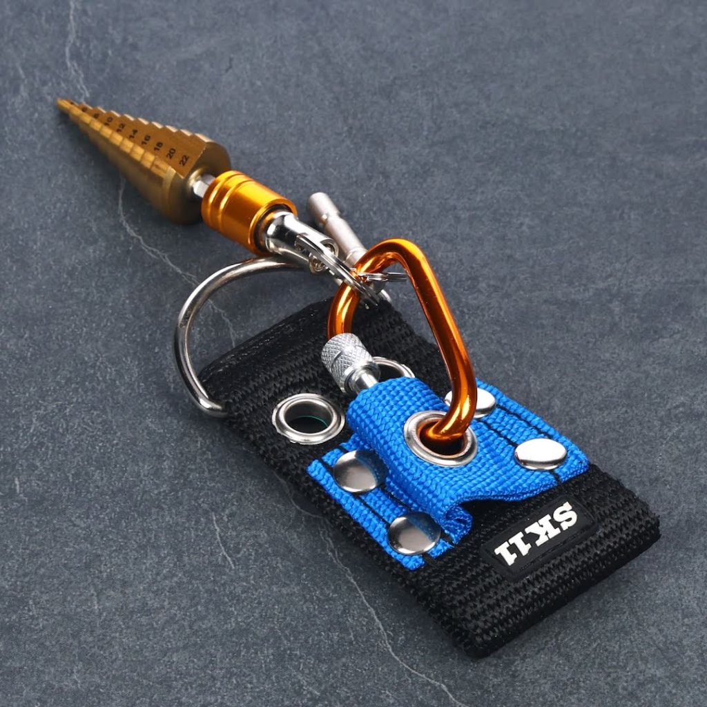 SK11 držák nářadí, model SQHBE-SETY, je navržen pro snadné připevnění na pracovní pásy, což vám umožňuje mít nástroje bezpečně u sebe. Tato sada obsahuje poutko na opasek pro pohodlnou instalaci a D-kroužek pro připojení šňůr proti pádu. Vyrobeno z lehkého hliníku, tento držák je o 20 % lehčí než předchozí modely a vyznačuje se karabinou se šroubovým zámkem pro vyšší bezpečnost. Ideální pro prevenci pádu nástrojů a klíčů, podporuje šířky pásů až do 55 mm.