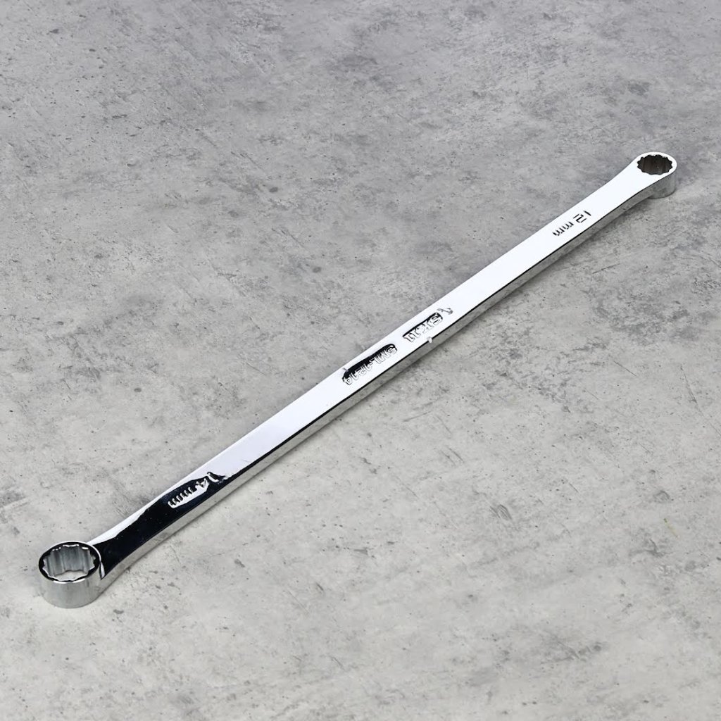 Extra dlouhý očkový klíč SK11, je všestranný nástroj pro utahování a povolování šestihranných šroubů a matic, zejména v těžko přístupných místech. Díky své dlouhé délce 330 mm nabízí tento klíč zvýšenou páku, což ho činí ideálním pro aplikace s vysokým točivým momentem. Jeho odsazený design umožňuje použití i tehdy, když je matice nebo šroub obklopen zápustnou dírou. Jeho zrcadlově leštěný hladký povrch zaručuje jak odolnost, tak elegantní vzhled. Vyrobeno z chromovaných materiálů.