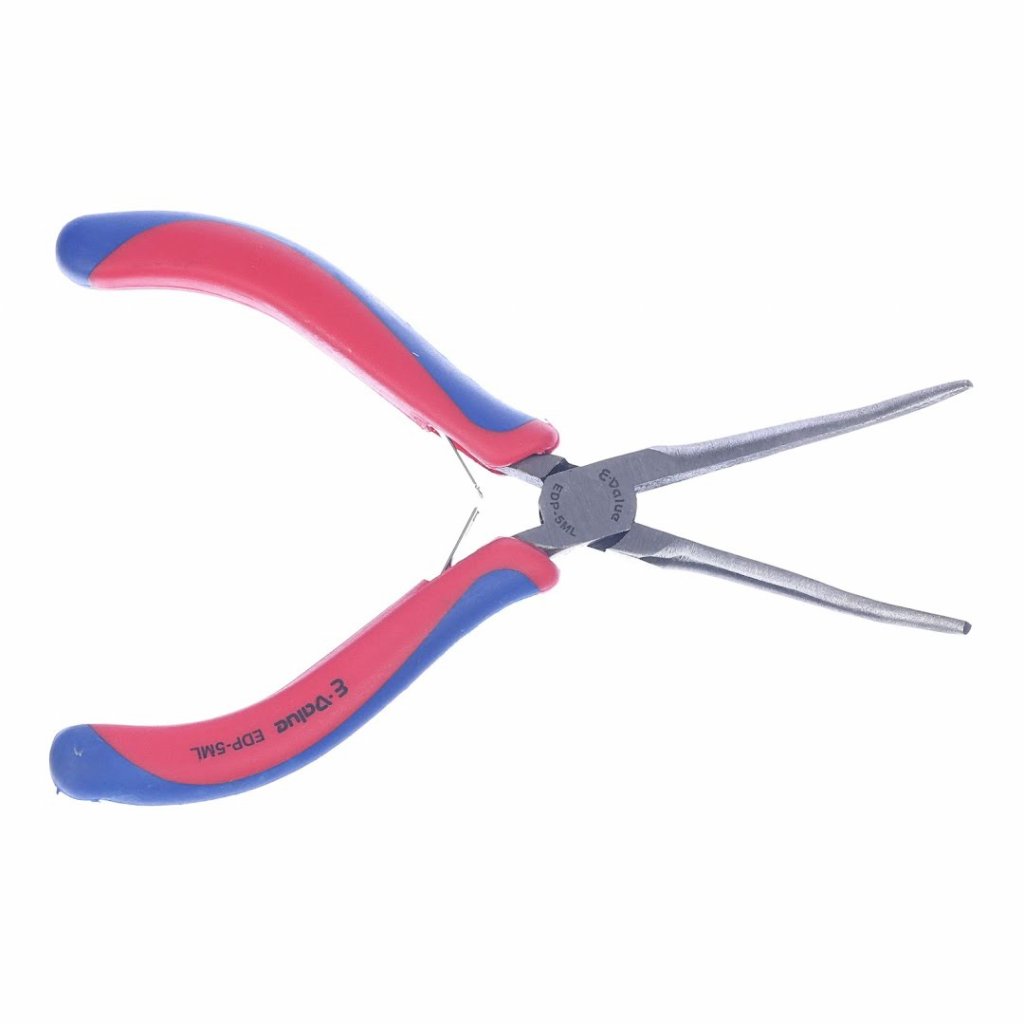 Kleště s jehlicovitými zahnutými čelistmi E-VALUE, model EDP-5ML, jsou všestranným nástrojem pro precizní práci při všech činnostech, včetně uchopování a ohýbání. Jejich kompaktní velikost, šířka 54 mm, výška 11 mm, hloubka 150 mm a nízká hmotnost 70 g umožňují snadnou manipulaci. Kleště mají měkkou rukojeť pro pohodlné použití, což umožňuje dlouhodobou práci bez únavy. Jsou navrženy pro domácí i profesionální práce, s celkovou délkou 150 mm jsou E-VALUE kleště nezbytným nástrojem pro vaše projekty.
