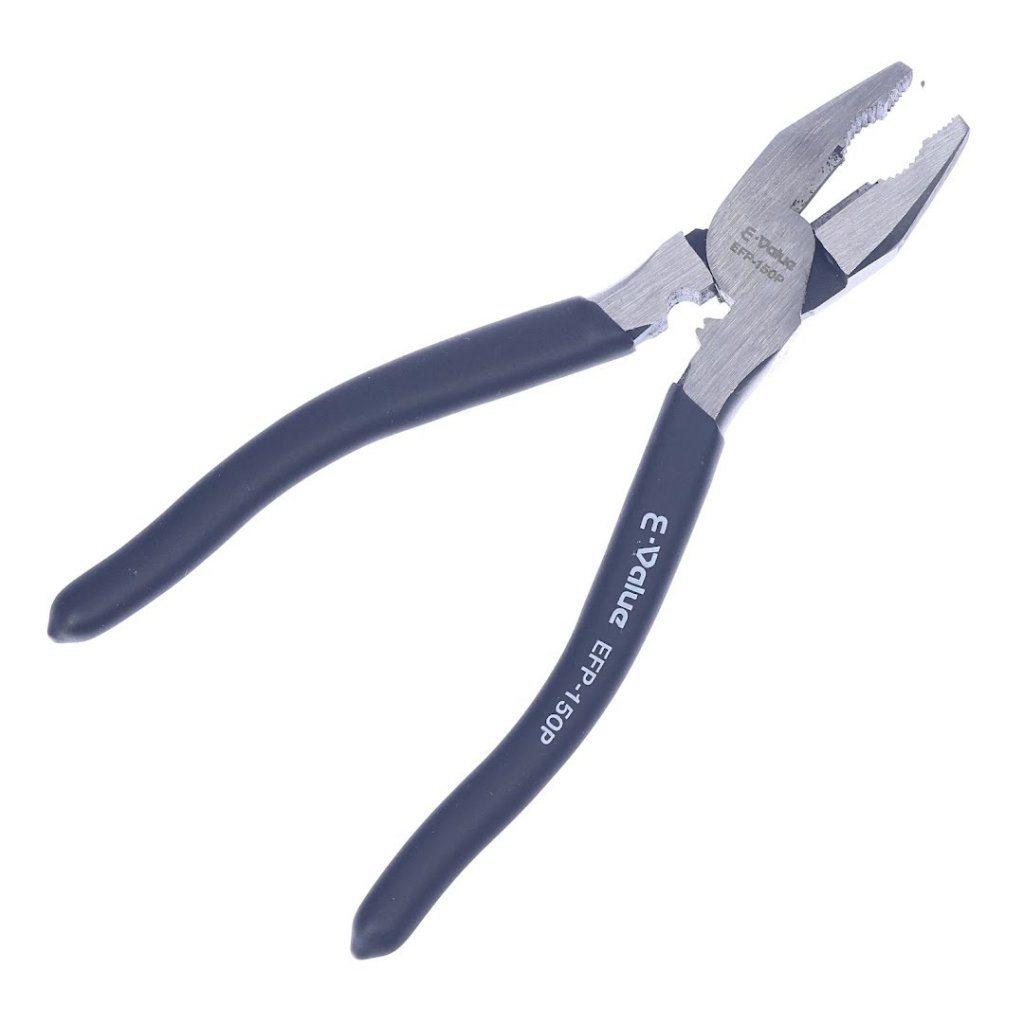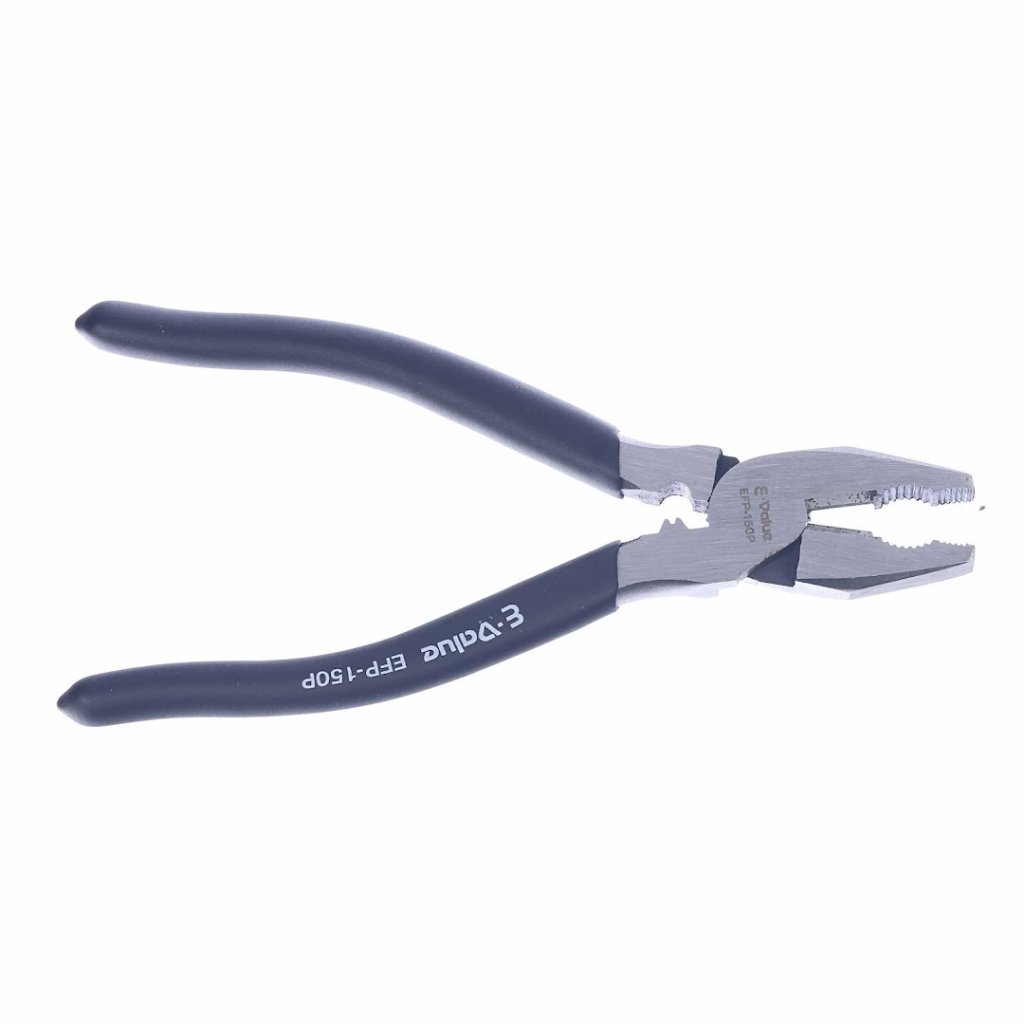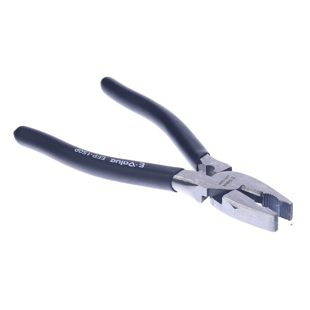 Univerzální kleště E-VALUE pro uchopování a stříhání. Kleště jsou lehké s měkkými rukojeťmi vhodné ke stříhání měkkého železného drátu do 1,2 mm.