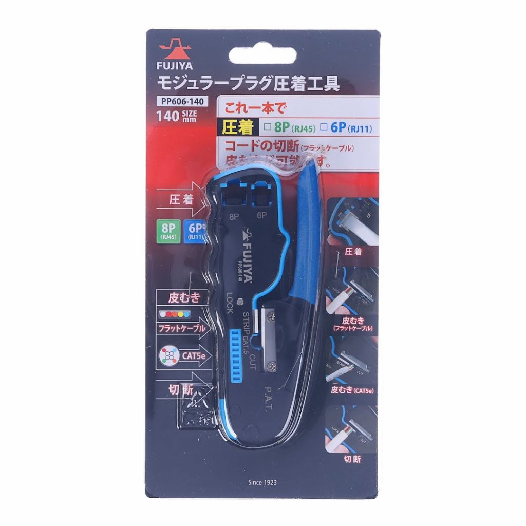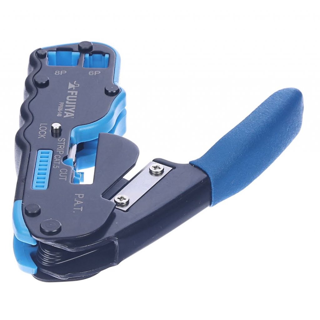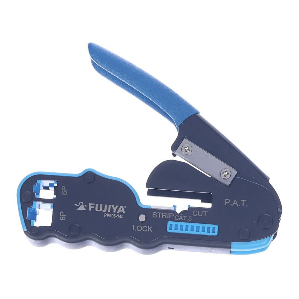 FUJIYA Krimpovací kleště na modulární konektory jsou univerzálním nástrojem pro přesné krimpování při práci s kabely. Jejich kompaktní tělo integruje základní funkce, jako je krimpování, stříhání a odizolování kabelů. Vhodné pro standardní modulární konektory 8P (RJ45) a 6P (RJ11), jsou nepostradatelným nástrojem pro práci s plochými a LAN kabely (CAT5e). Jejich rozměry (šířka 65 mm x výška 25 mm x hloubka 140 mm) a hmotnost (308 g) je činí snadno ovladatelnými a použitelnými.