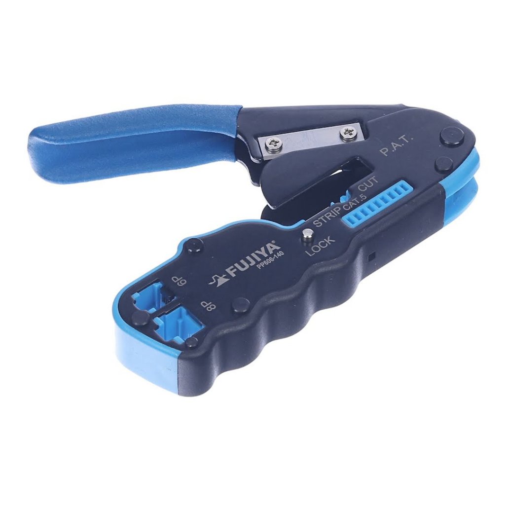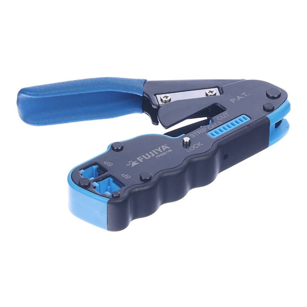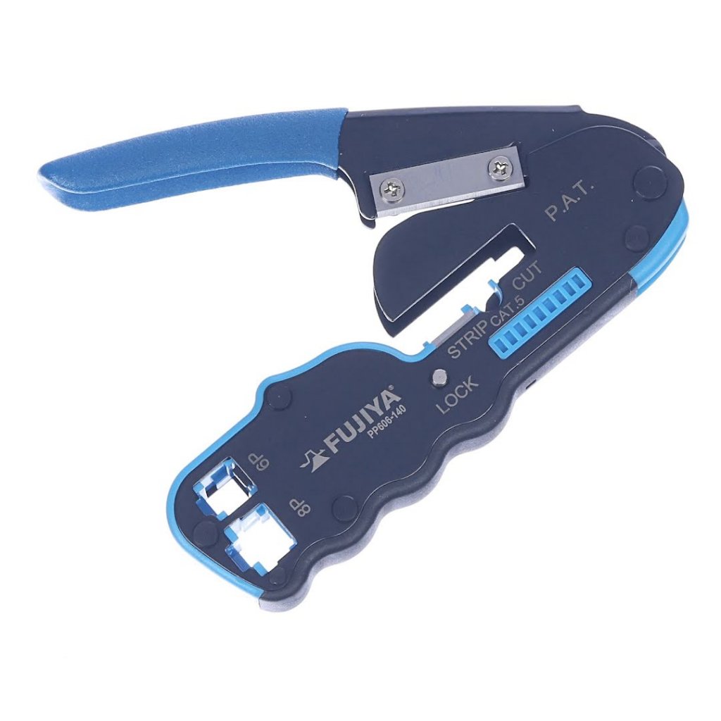 FUJIYA Krimpovací kleště na modulární konektory jsou univerzálním nástrojem pro přesné krimpování při práci s kabely. Jejich kompaktní tělo integruje základní funkce, jako je krimpování, stříhání a odizolování kabelů. Vhodné pro standardní modulární konektory 8P (RJ45) a 6P (RJ11), jsou nepostradatelným nástrojem pro práci s plochými a LAN kabely (CAT5e). Jejich rozměry (šířka 65 mm x výška 25 mm x hloubka 140 mm) a hmotnost (308 g) je činí snadno ovladatelnými a použitelnými.