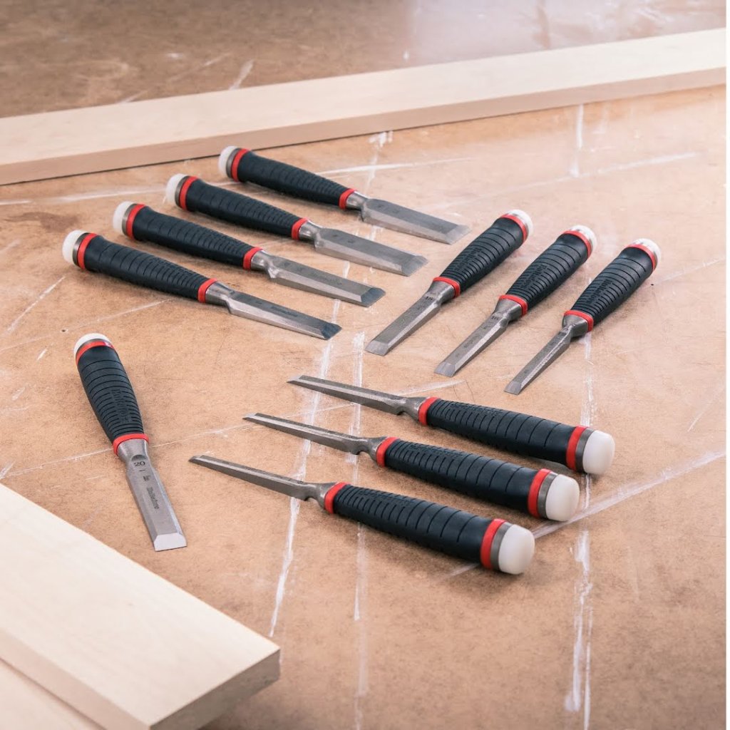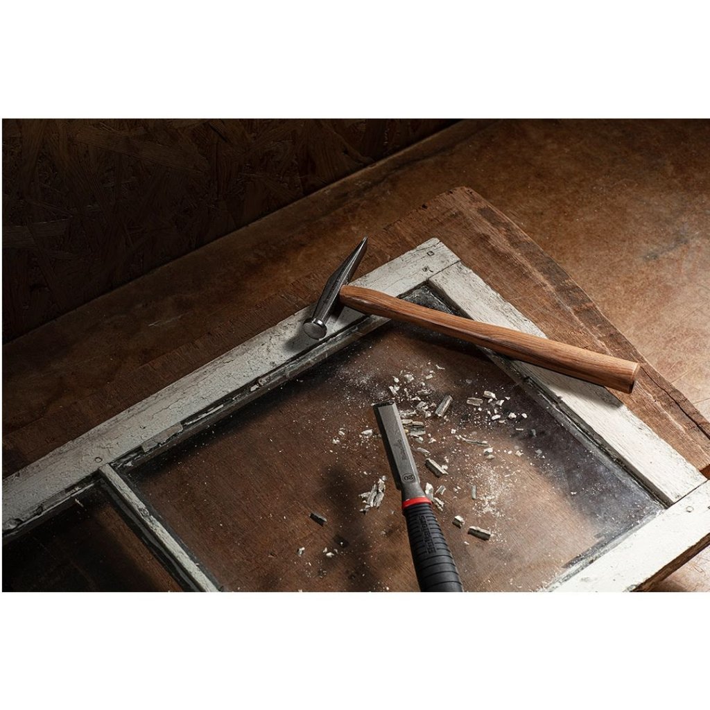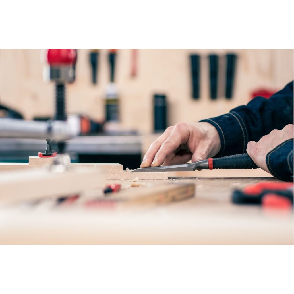 Břit broušený pod úhlem 25° poskytuje optimální rovnováhu mezi ostrostí a trvanlivostí, což umožňuje jak silové údery, tak precizní práci. Speciálně navržená plochá spodní strana čepele je klíčová pro provádění dokonale rovných a paralelních řezů podél povrchů. Ergonomická rukojeť ze Santoprenu zaručuje pohodlný a bezpečný úchop i při dlouhodobém používání, zatímco vyměnitelný nylonový nárazník chrání rukojeť a prodlužuje celkovou životnost nástroje.