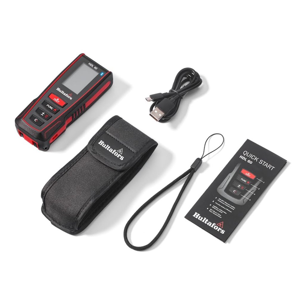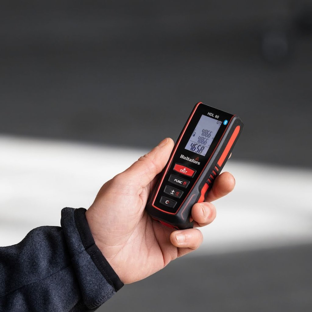 HDL 60 je navržený pro maximální pohodlí a univerzální použití. Umožňuje nejen měření vzdáleností, ale také výpočet ploch a objemů, ukládání naměřených hodnot či použití funkcí pro průběžné měření a sčítání/odčítání. Pokud není přímý přístup možný, oceníte funkci nepřímého měření délek a výšek na dálku. Díky rozhraní Bluetooth snadno propojíte dálkoměr s aplikací Hultafors Measure a můžete tak okamžitě ukládat, dokumentovat a sdílet výsledky přímo z mobilního zařízení – což výrazně urychlí práci na stavbě i v kanceláři.