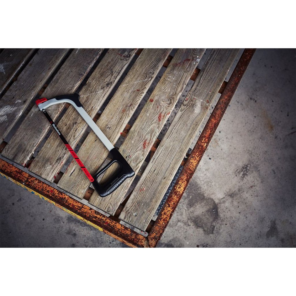 Základem pily je pevný ocelový rám, který udržuje pilový list pod vysokým napětím, což zaručuje dokonale rovné a čisté řezy v různých materiálech. Ergonomicky tvarovaná rukojeť z litého hliníku s pohodlným úchopem poskytuje vynikající kontrolu nad řezem a snižuje únavu ruky i při delší práci. Pro maximální všestrannost lze pilový list naklopit a provádět přesné řezy těsně podél rovných povrchů. Výměna pilového listu je navíc otázkou okamžiku díky integrovanému pružinovému napínáku.