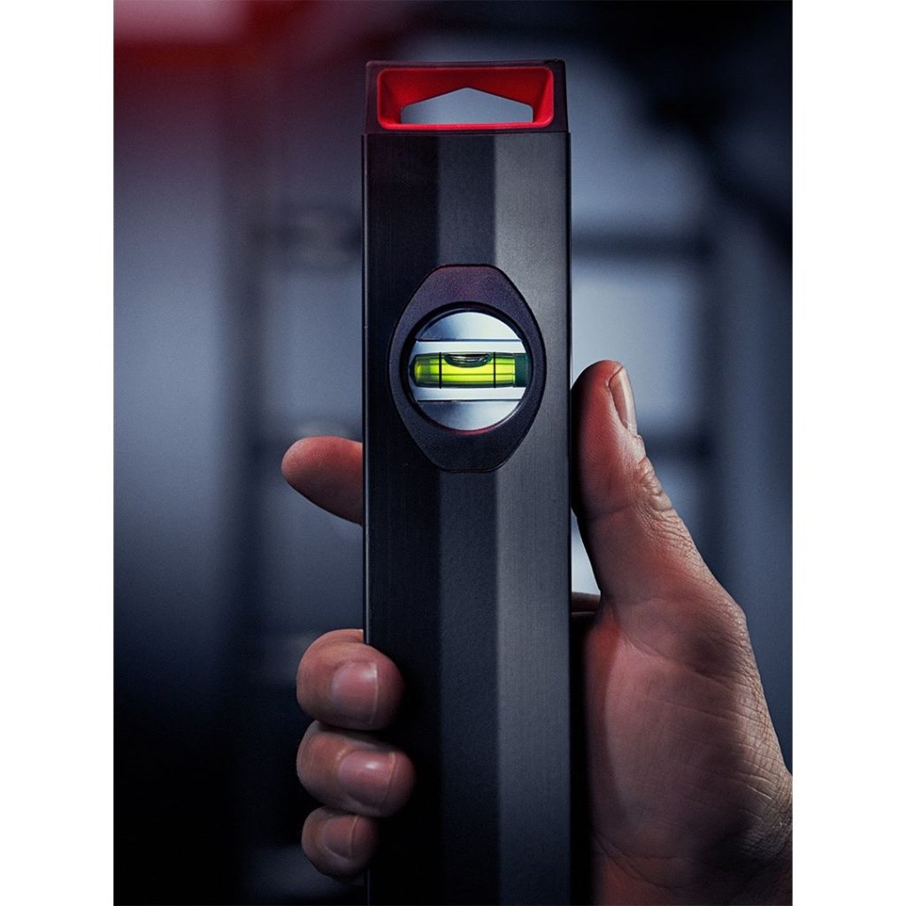 Klíčem k přesnosti jsou nerozbitné blokové libely s vynikající průhledností a odolností vůči UV záření. Horizontální libela je vybavena čočkou s 30% zvětšením a luminiscenčním reflektorem, což výrazně usnadňuje odečítání hodnot i za zhoršených světelných podmínek. Nárazuvzdorné koncovky a teplotně odolné uchycení libel chrání vodováhu před poškozením a udržují její kalibraci i v náročném prostředí. S citlivostí 10 mm/m a tolerancí pouhých ±0,5 mm/m se můžete spolehnout na bezchybné výsledky.