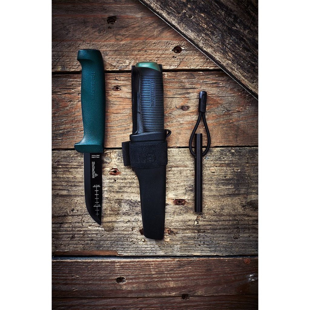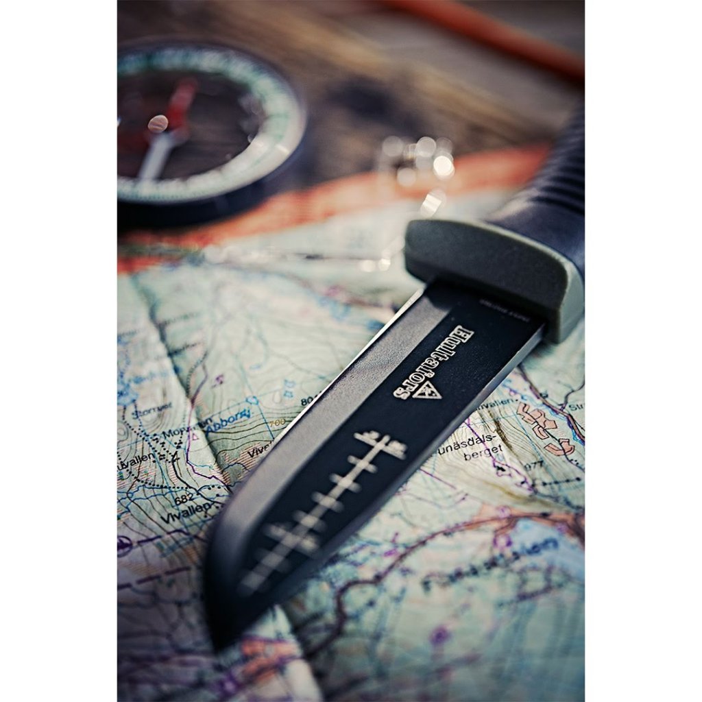 Jádrem nože je 3 mm silná čepel vyrobená z kvalitní japonské uhlíkové oceli, která vyniká svou houževnatostí. Skandinávský výbrus zaručuje mimořádnou ostrost a zároveň umožňuje snadné broušení přímo v terénu. Celá čepel je ošetřena černým EPD povlakem, který ji účinně chrání proti korozi a prodlužuje její životnost. Hřbet čepele je navíc speciálně upraven pro použití s křesadlem a praktická ryska na čepeli usnadňuje měření. Ergonomicky tvarovaná rukojeť z odolného PP plastu s protiskluzovým povrchem Santoprene poskytuje bezpečný a pohodlný úchop i při náročné práci. Nůž je dodáván s robustním textilním pouzdrem, které lze připevnit na opasek o šířce až 80 mm a obsahuje samostatnou kapsu na křesadlo, takže máte vše důležité vždy pohromadě.
