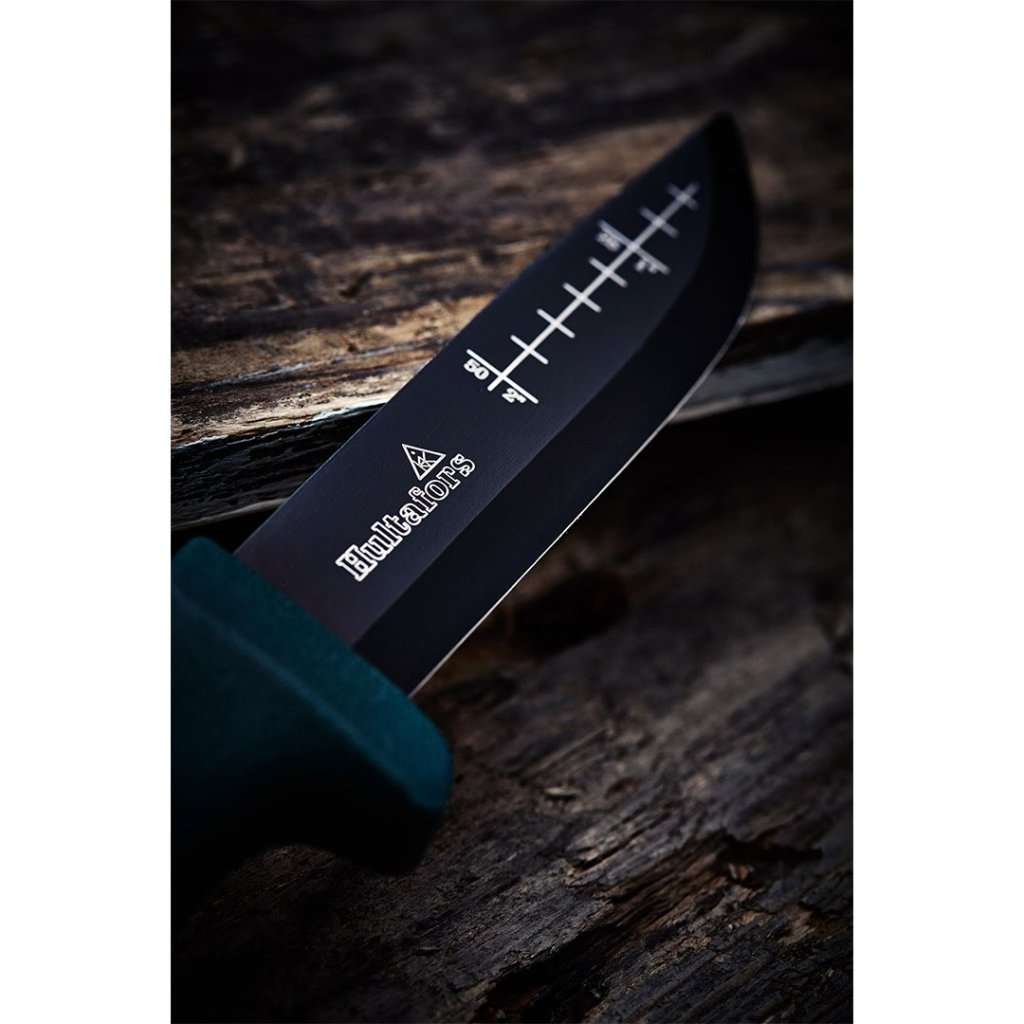 Srdcem nože OK1 je 3 mm silná čepel vyrobená z vysoce kvalitní japonské uhlíkové oceli, která je zakalena na tvrdost 58–60 HRC pro mimořádnou odolnost a dlouhotrvající ostrost. Skandinávský výbrus zaručuje nejen vynikající řezné vlastnosti, ale také snadné broušení v terénu. Čepel je navíc chráněna speciální antikorozní povrchovou úpravou EPD, která výrazně prodlužuje její životnost. Mimořádně velká a ergonomicky tvarovaná rukojeť z odolného polypropylenu zajišťuje pevný a bezpečný úchop i při náročné a dlouhodobé práci.