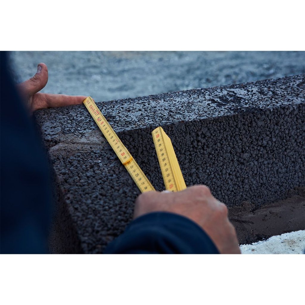 Pro snadné a rychlé odečítání hodnot je metr vybaven přehlednou metrickou stupnicí v černé barvě na obou stranách, doplněnou o červeně značené decimetrové číslice. Stupnice je chráněna speciální fólií proti otěru, což zaručuje její dlouhodobou čitelnost i při každodenním používání. Jednotlivé díly metru lze navíc aretovat v úhlu 90 stupňů, což výrazně usnadňuje práci ve stísněných prostorech a umožňuje flexibilní měření.