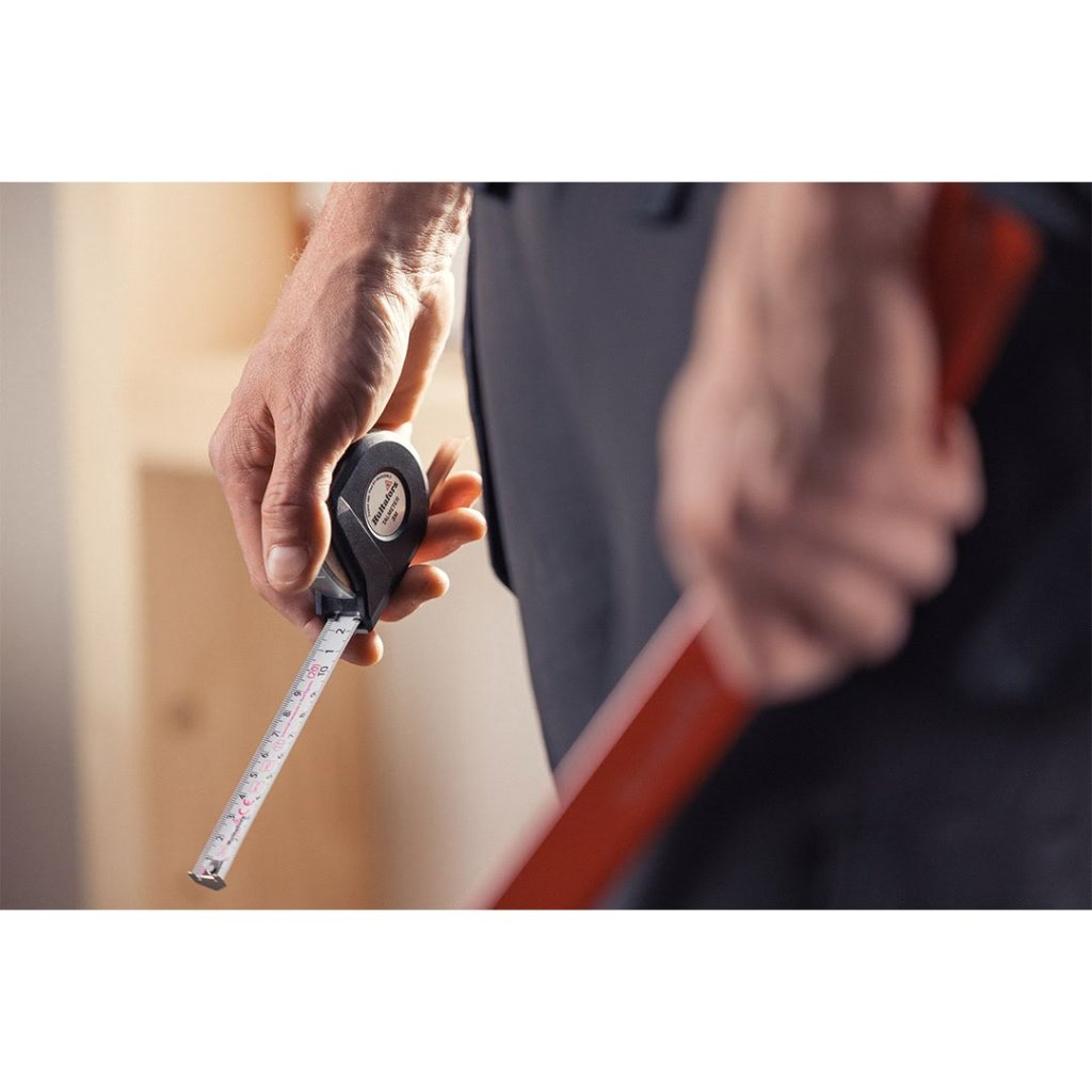 Základem metru je bílá, nárazuvzdorná ocelová páska o šířce 16 mm s dobře čitelnou milimetrovou stupnicí. Unikátní funkce posuvného měřítka umožňuje snadno a přesně rýsovat kruhové tvary, zatímco stupnice na zadní straně pásky slouží k rychlému měření průměrů. Během práce je páska bezpečně zajištěna proti posunu, což zaručuje konzistentní výsledky. Ergonomický posuvný držák usnadňuje nastavení a vysouvání pásky, a díky možnosti výměny pásky i posuvného měřítka se prodlužuje celková životnost nástroje.