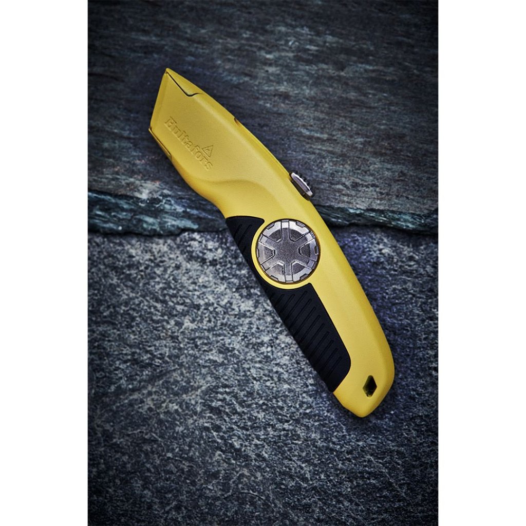 Klíčovým bezpečnostním prvkem je mechanismus automatického zasouvání, který čepel okamžitě skryje po uvolnění tlaku na posuvník, čímž výrazně snižuje riziko úrazu. Ergonomicky tvarovaná, šikmá rukojeť s protiskluzovou úpravou zajišťuje pevný a pohodlný úchop. To vám dává plnou kontrolu i při řezání tuhých materiálů, jako jsou sádrokartonové desky. Odolné hliníkové tělo zaručuje dlouhou životnost nože i v náročných podmínkách.