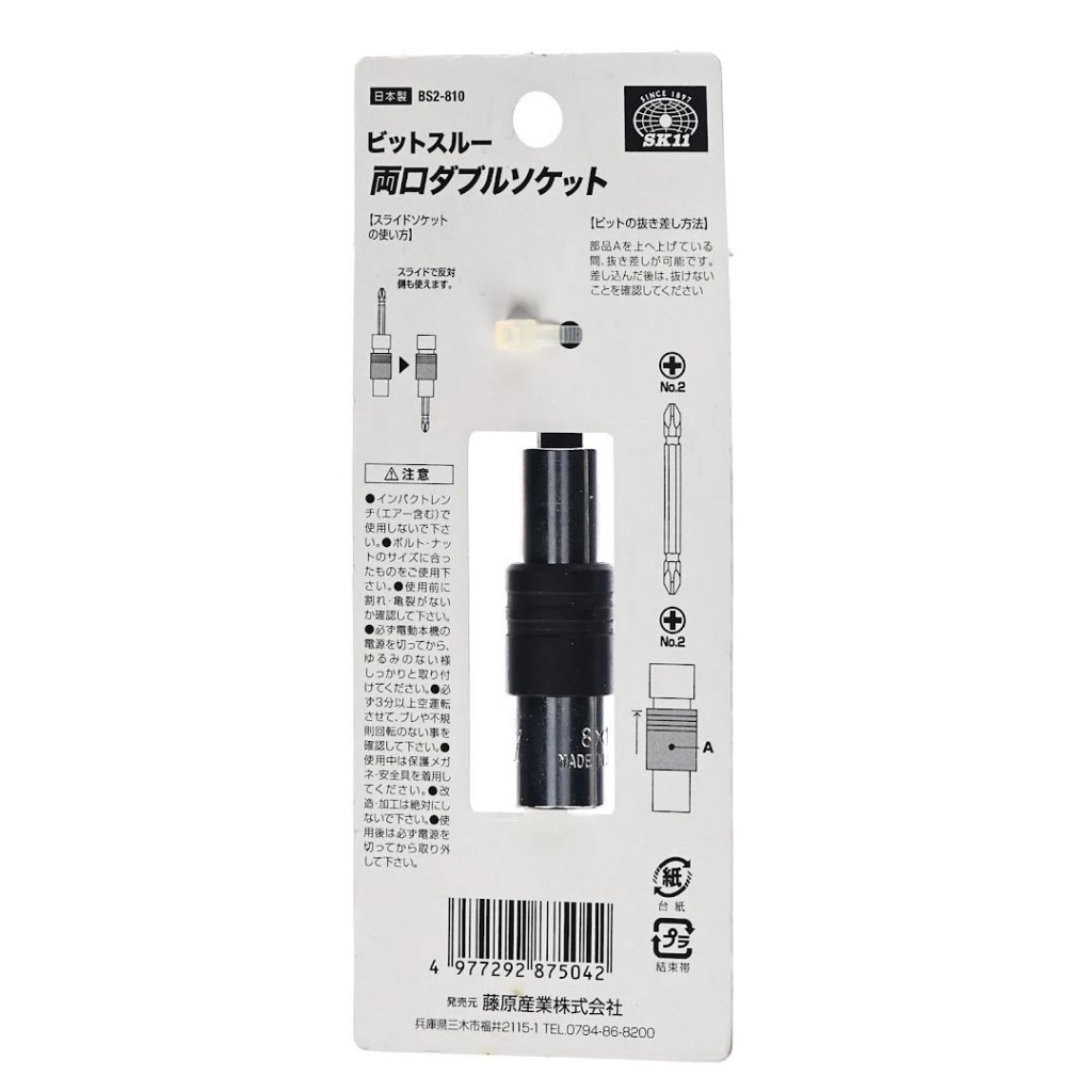Japonská dvoustranná hlavice SK11, model BS2-810, je všestranný nástroj ideální pro montážní práce. Je kompatibilní s rázovými utahováky a elektrickými šroubováky. Disponuje unikátním vyměnitelným hřídelem, který umožňuje použití s bity přes 75 mm, pokud se hřídel zlomí. Tato multifunkční hlavice podporuje velikosti 8 mm a 10 mm a je vhodná pro upevnění dříkem 6,35 mm.