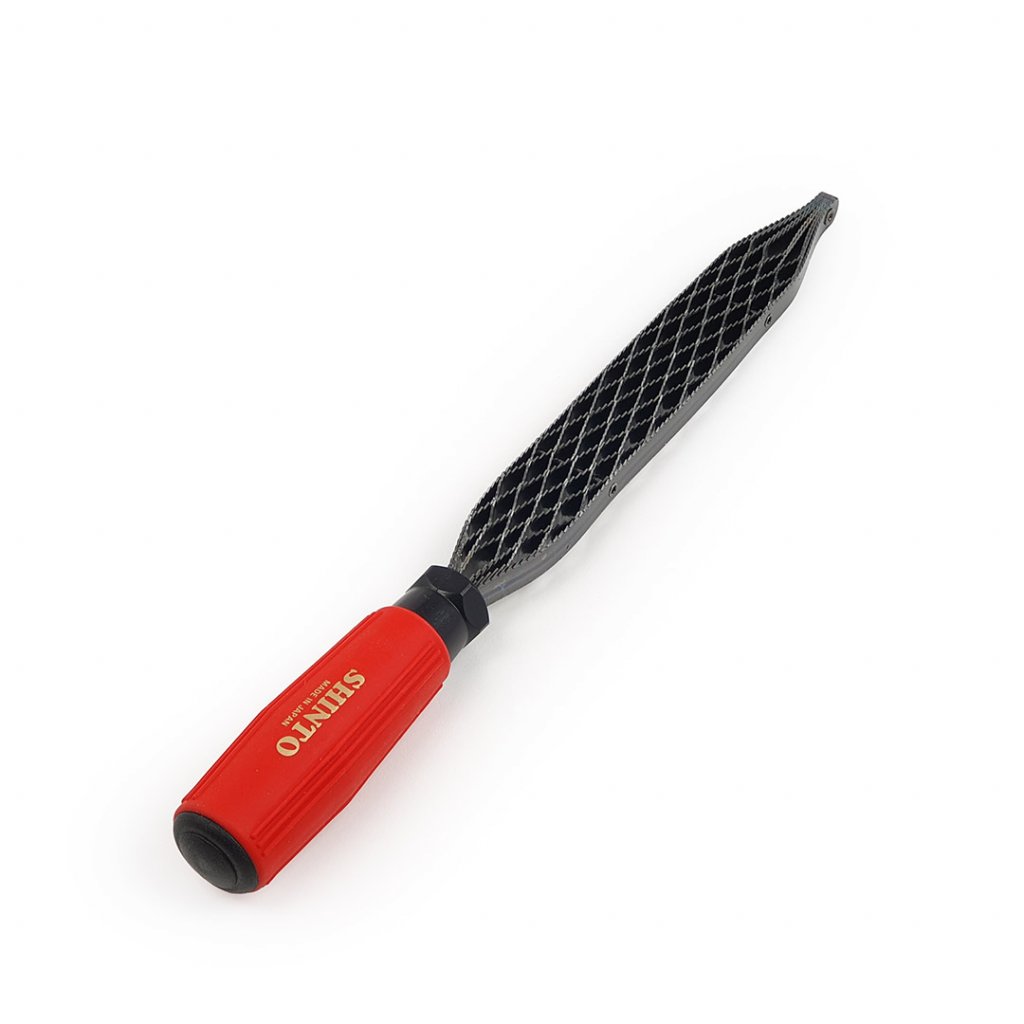 Jedinečná konstrukce této japonské rašple na dřevo se skládá z 10 kalených klikatých pilových listů snýtovaných dohromady, které tvoří širokou řeznou plochu. Největší výhoda této unikátní rašple je její dutá konstrukce, která eliminuje ucpávání. Tyto rašple jsou sice vyrobeny pro opracování dřeva, ale jsou vhodné i pro měkké kovy (např. hliníku či mosazi), plasty nebo sádru. Rašple Shinto umožňuje odstraňovat materiál vysokou rychlostí. Zuby se rozšiřují až k okraji, což výrazně usnadňuje práci v rozích. Rašple je vybavena protiskluzovou ergonomickou rukojetí s dvojitou strukturou z plastu a elastomeru. Vyrobeno v Japonsku.