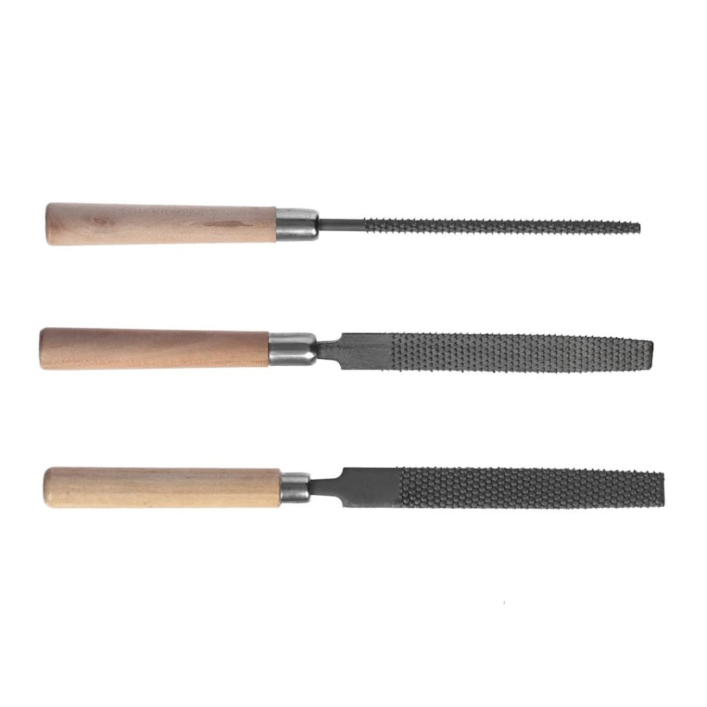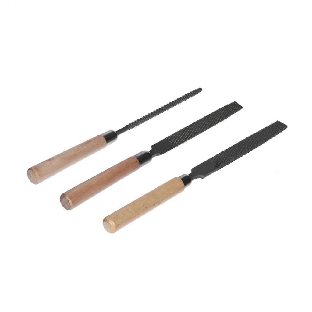 Sada rašplí SK11 je nezbytná pro nadšence do zpracování dřeva. Tato sada obsahuje tři rašple: plochou, kulatou a půlkulatou, každou navrženou pro různé úkoly malého detailního pilování a broušení dřeva. S celkovou délkou 200 mm jsou tyto rašple vybaveny odolnými dřevěnými rukojeťmi pro pohodlný úchop. Každá rašple má hrubý zubový vzor, který je ideální pro efektivní odstraňování materiálu.