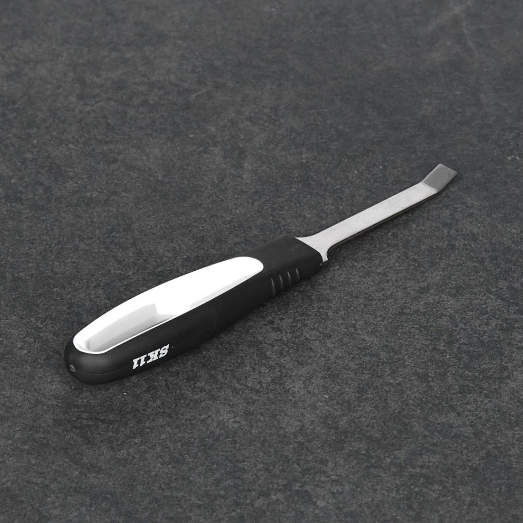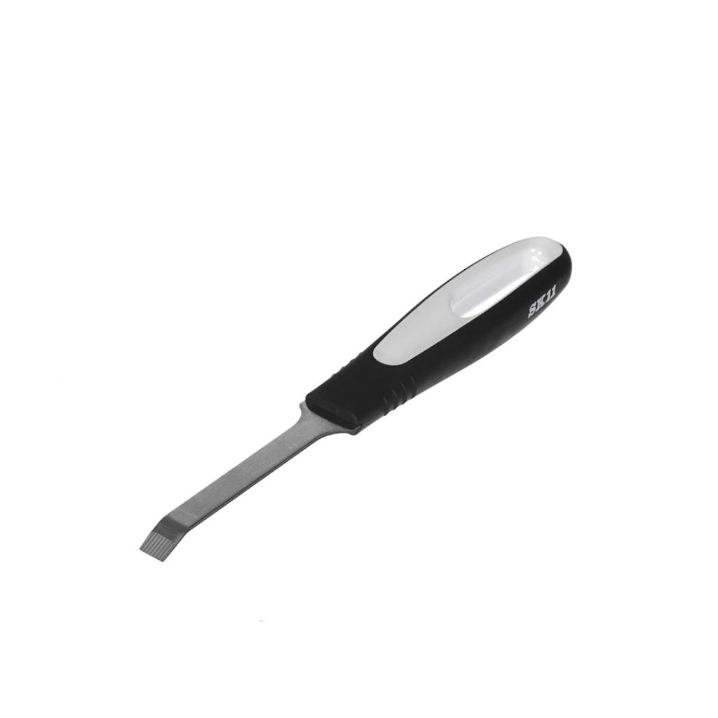 Japonská dlouhá a ohnutá špachtle SK11, efektivně čistí okenní rámy a úzké prostory. Tato špachtle má rukojeť s měkkou strukturou, která se snadno drží, i když máte na rukou rukavice. Ohnutá špička je ideální pro seškrabávání špíny z rohů, zatímco nerezová ocelová čepel zajišťuje odolnost a rezistentnost vůči korozi. Navíc rukojeť obsahuje velký otvor pro připevnění šňůrky nebo hadříku, což zvyšuje funkčnost a bezpečnost.
