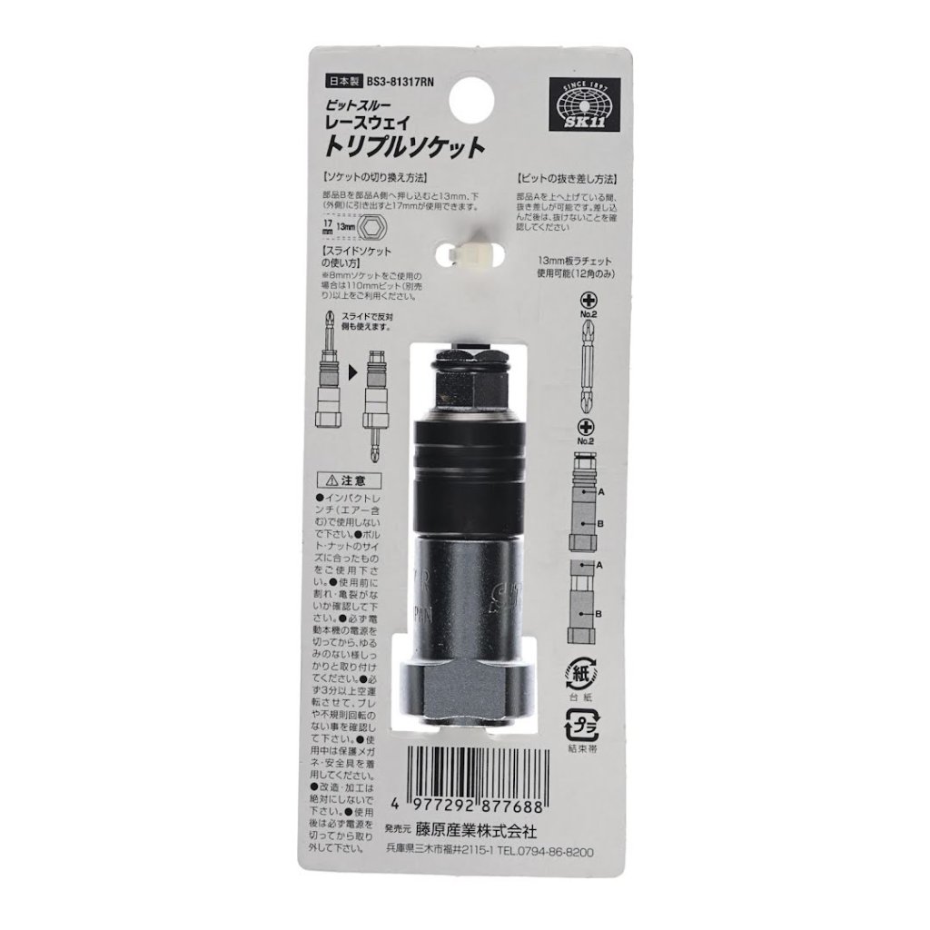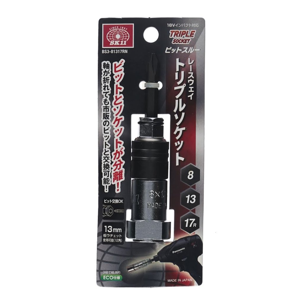Japonská trojitá nástrčná hlavice SK11, model BS3-81317RN, je univerzální nástroj navržený pro rázové utahováky a ráčnové klíče. Umožňuje připojení bitů o délce přes 110 mm. Díky designu vyměnitelného hnacího hřídele zajišťuje pokračování v práci i v případě, že se hřídel zlomí. Kompatibilní s elektrickým i ručním nářadím, podporuje velikosti 8, 13 a 17 mm se šestihranným designem nástrčné hlavice, a je vhodná pro 18 V rázové utahováky.