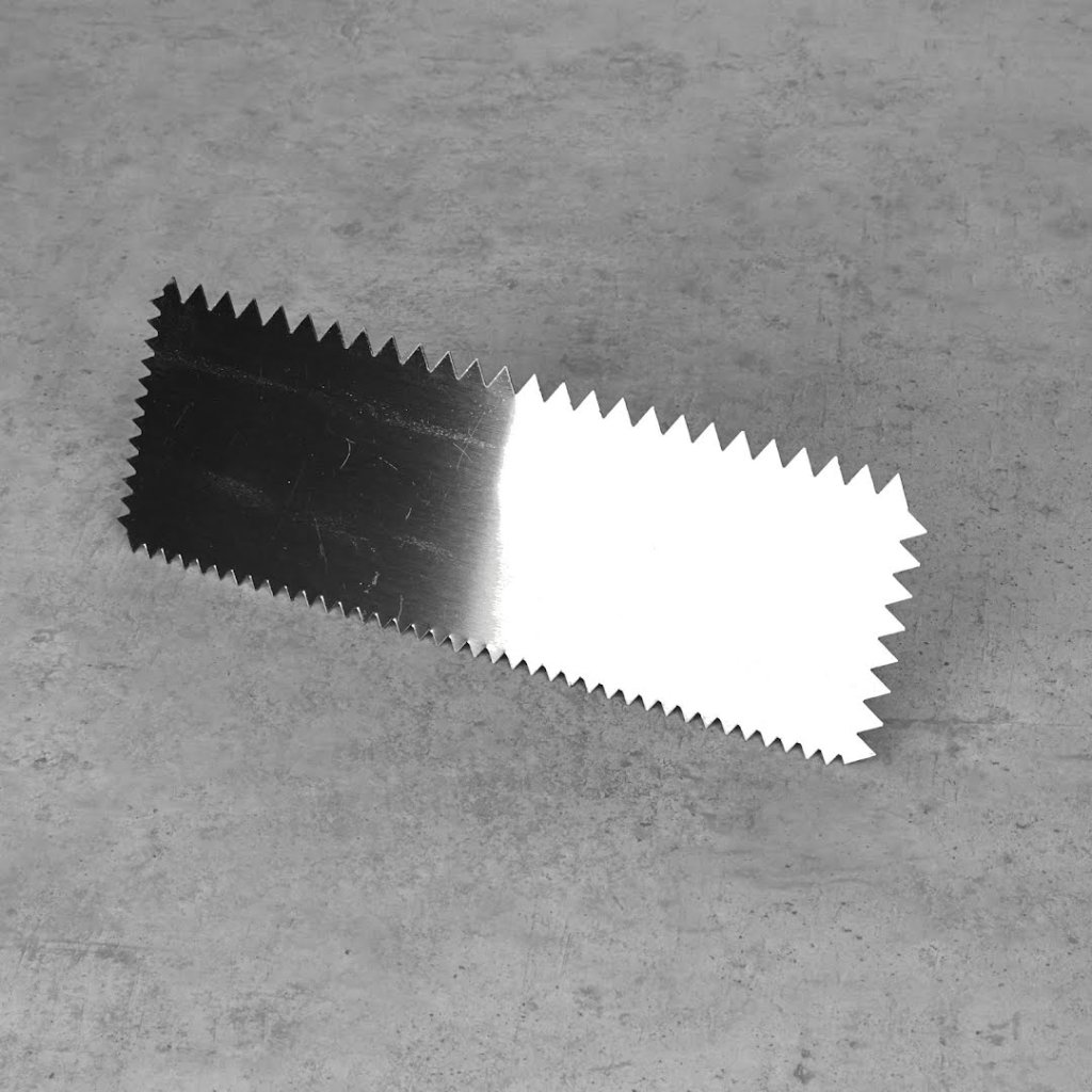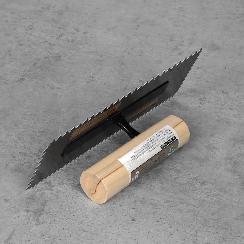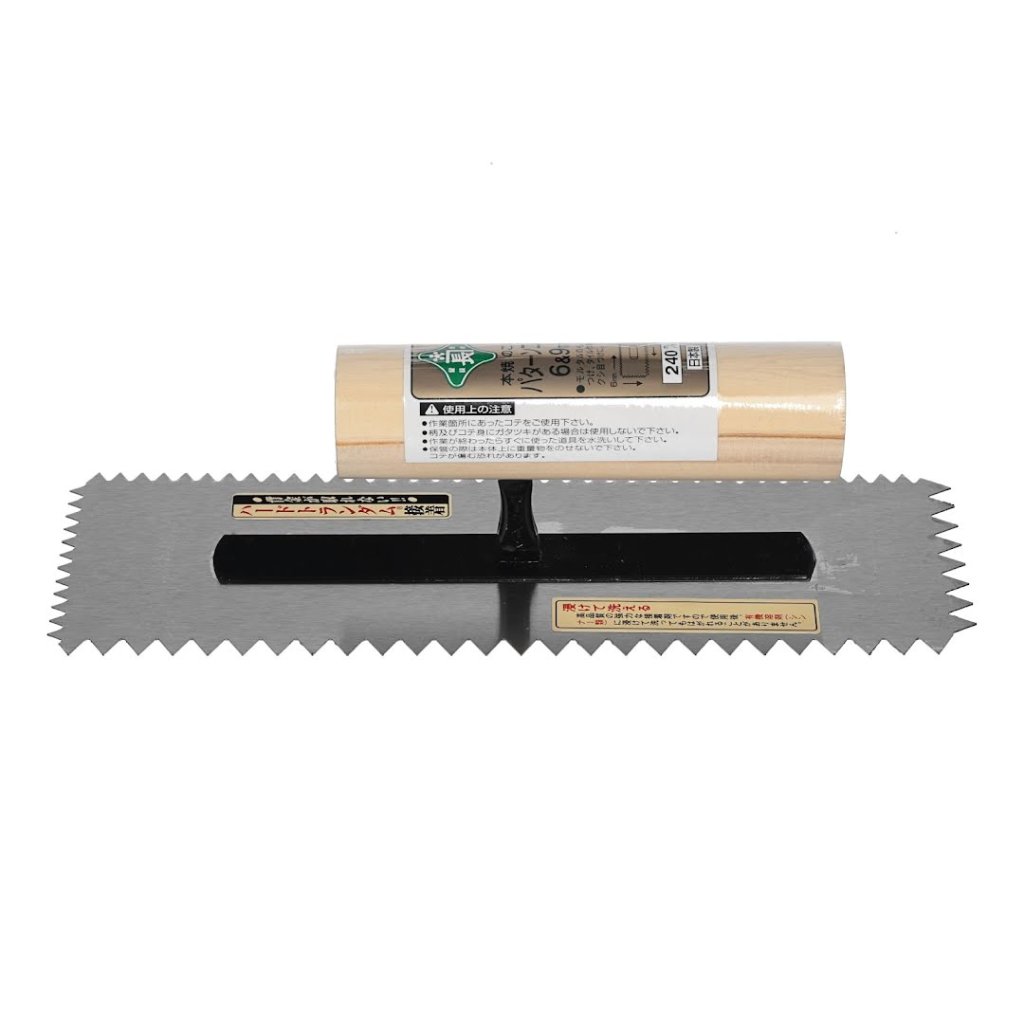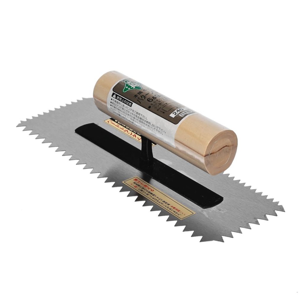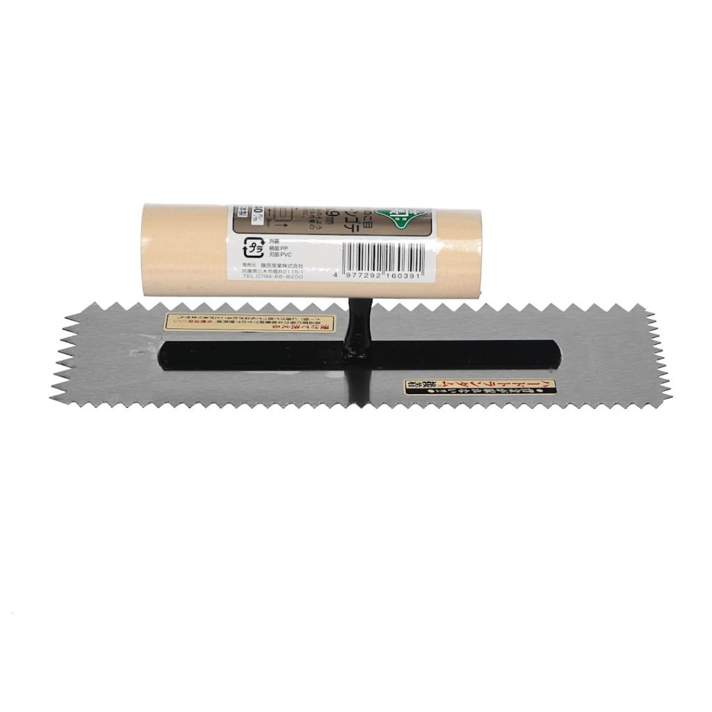 Hladítko MIDORI KANECHO je univerzální pro aplikace malty se vzory z drážek a práce s dlaždicemi. Obsahuje zářezy ve tvaru V o velikosti 6 mm a 9 mm. Měří 240 mm na šířku a má 0,5 mm silnou čepel. Navíc ji lze snadno čistit organickými rozpouštědly, což zajišťuje trvanlivost a snadnou údržbu. Vyrobeno v Japonsku.