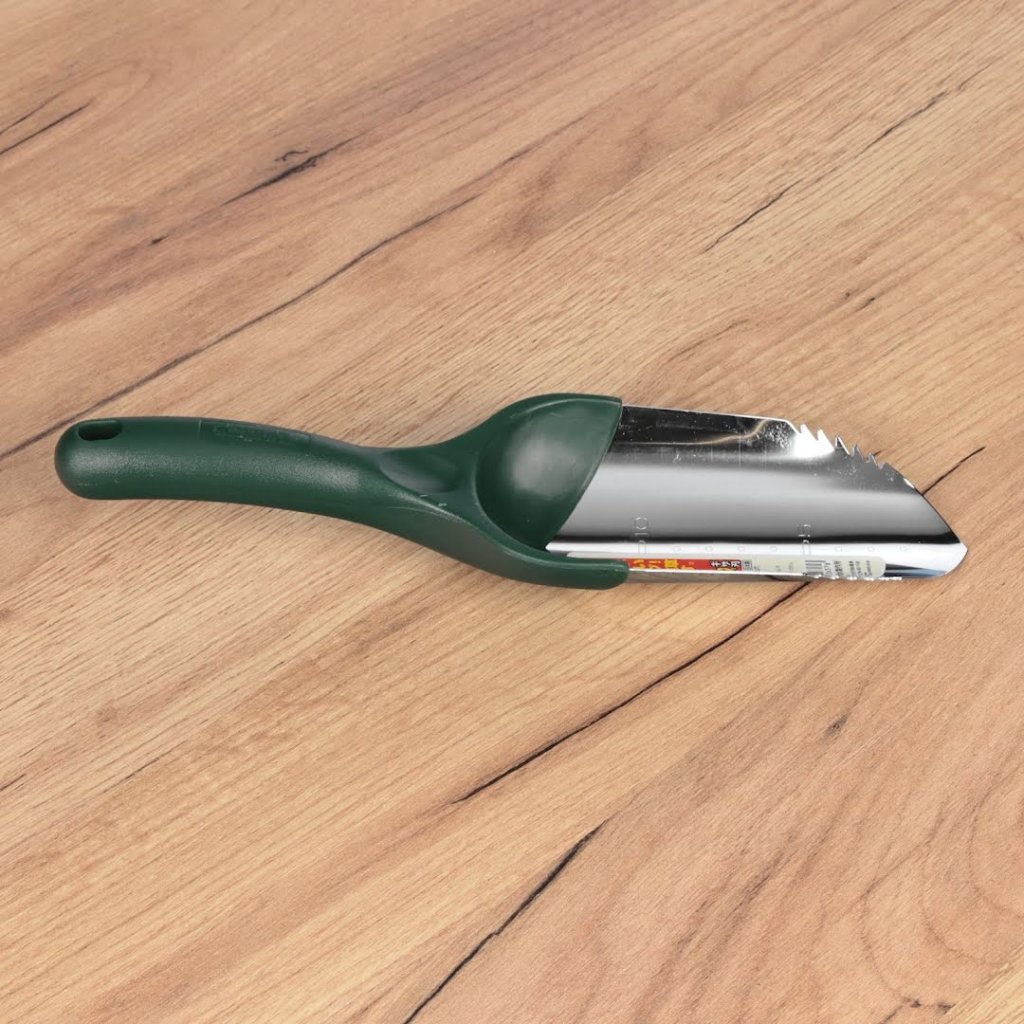 Japonská zahradní lopatka MONT BLANC je všestranným nástrojem pro zahradnické práce. Tato lopatka disponuje zubatým ostřím, které umožňuje snadné odstranění plevele. Její tenká čepel poskytuje vynikající průnik do půdy, což usnadňuje vaši práci. Díky hlubokému designu lopatky může pojmout velké množství půdy a označení na čepeli jsou ideální pro přesné sázení cibulovin. Čepel je pochromovaná pro odolnost, zajišťující dlouhotrvající výkon.