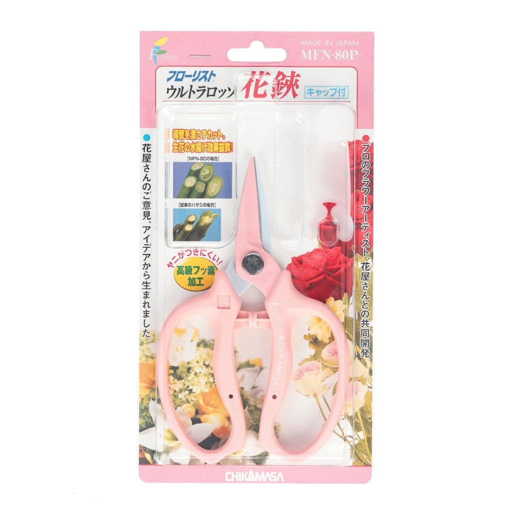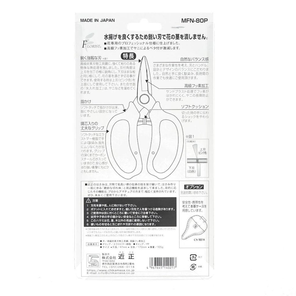 Nůžky na aranžování květin CHIKAMASA, model MFN-80P, jsou odborně navrženy pro péči o čerstvé květiny. Tyto nůžky mají jednočepelový design, který zajišťuje čisté řezy bez drcení tkáně květiny, čímž uchovávají její krásu a dlouhověkost. Čepel s fluorovou povrchovou úpravou zvyšuje odolnost a snižuje nános zbytků, zatímco měkký polštářek absorbuje nárazy během používání, poskytuje komfort a efektivitu. Navíc jsou nůžky dodávány s ochranným krytem pro bezpečné uložení.
