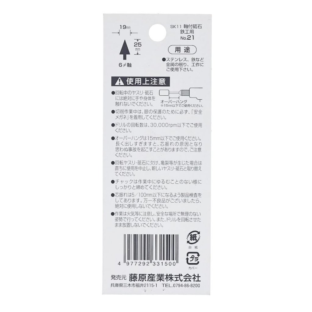 Japonské brusné tělísko SK11 No.21 je ideální pro broušení a tvarování kovů, jako je železo a nerezová ocel. Tento brusný kámen lze použít s elektrickými vrtačkami a pneumatickými bruskami, má průměr hřídele 6 mm a zrnitost WA60P. Pro optimální výkon zajistěte přesah 15 mm nebo méně a udržujte rychlosti vrtačky pod 30000 ot./min. Vyrobeno v Japonsku.