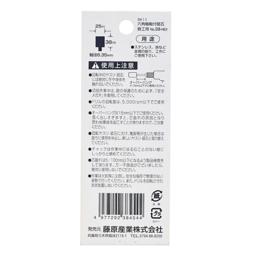 Brusné tělísko SK11 No.39-HEX je speciálně navrženo pro broušení a tvarování nerezové oceli a jiných kovů. Díky šestihranné stopce 6,35 mm může být rychle připojeno k rázovému utahováku pro efektivní použití. Maximální doporučené otáčky 5000 RPM a méně. Zrnitost WA60MV.