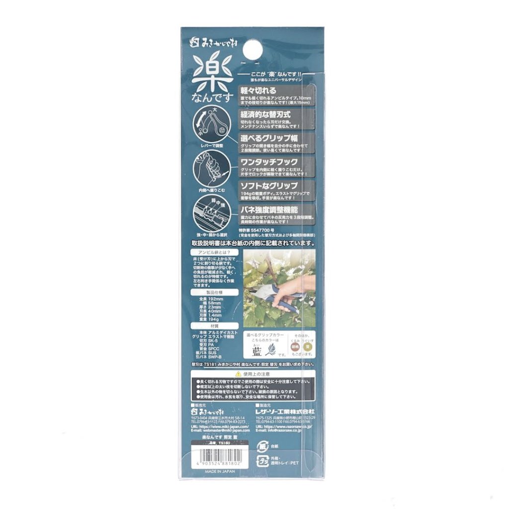 Japonské nastavitelné nůžky MIKI KAJIYA MURA, model TS180, jsou všestranným nástrojem navrženým pro zahradnické prořezávací úkoly. Jejich nastavitelná rukojeť umožňuje snadnou manipulaci s malými i velkými větvemi, a jsou variabilní dle velikosti rukou uživatele. Nůžky disponují třístupňovým nastavením napětí pružiny, aby vyhovovaly různé síle úchopu a pracovním požadavkům. Díky ekonomickému patentovanému systému vyměnitelných čepelí jsou tyto nůžky praktické a efektivní.