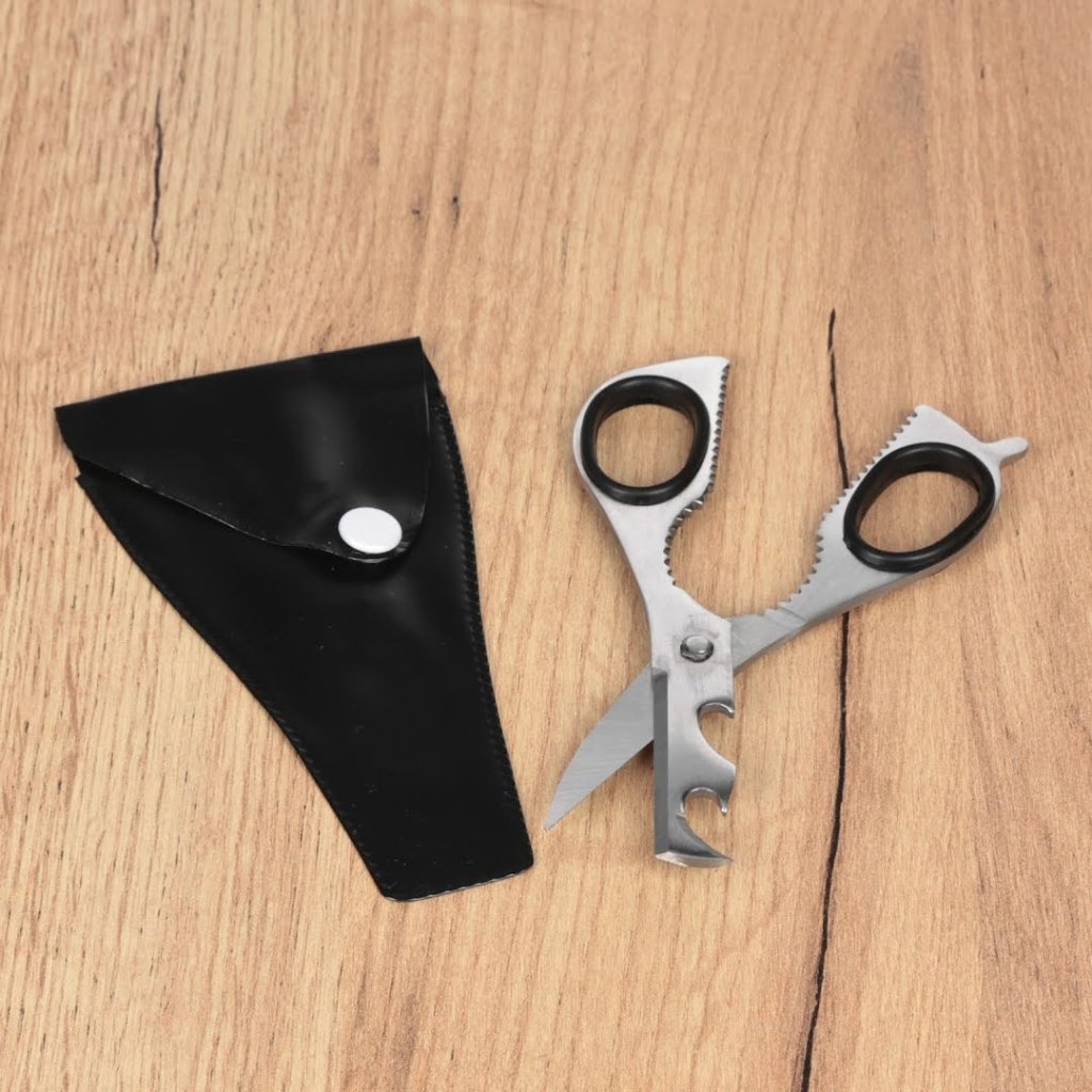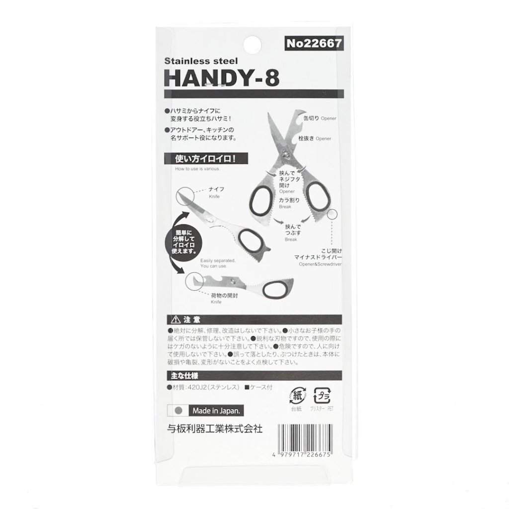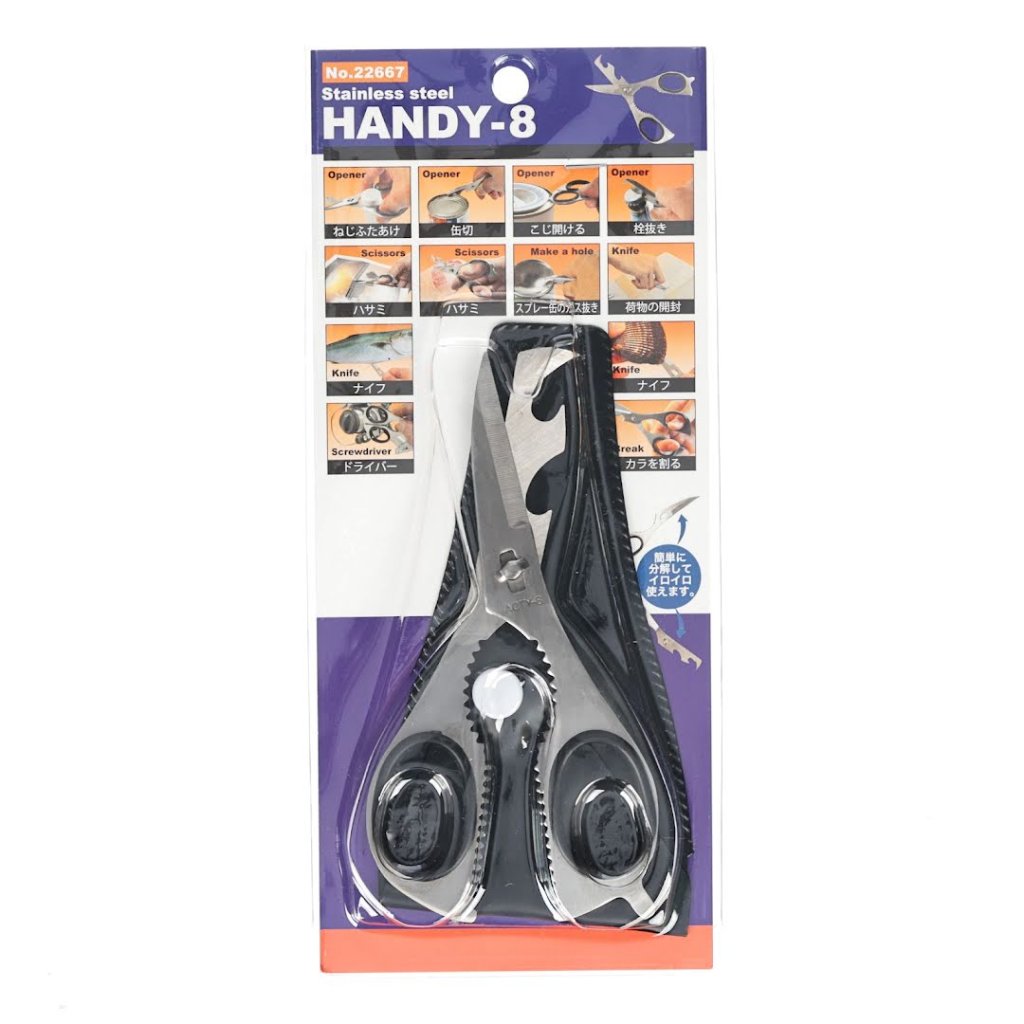 Japonské nerezové multifunkční nůžky Handy-8 YOITA, model č.22777, je všestranný, víceúčelový nástroj pro venkovní i kuchyňské použití. Plynule přechází z nůžek na nůž a zahrnuje funkce jako otvírák na lahve, otvírák na konzervy a šroubovák. Vyrobený z odolné nerezové oceli, je navržen pro pohodlí s oddělitelným designem, který umožňuje různé aplikace.