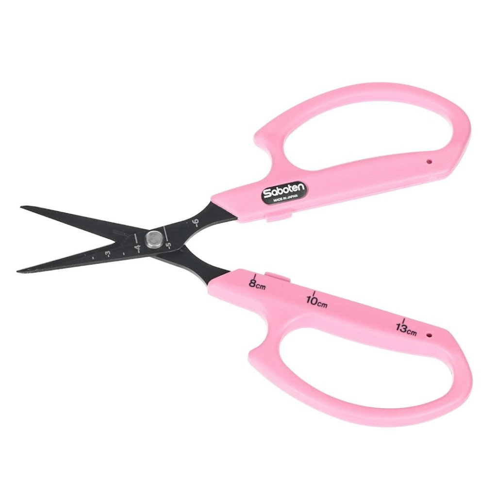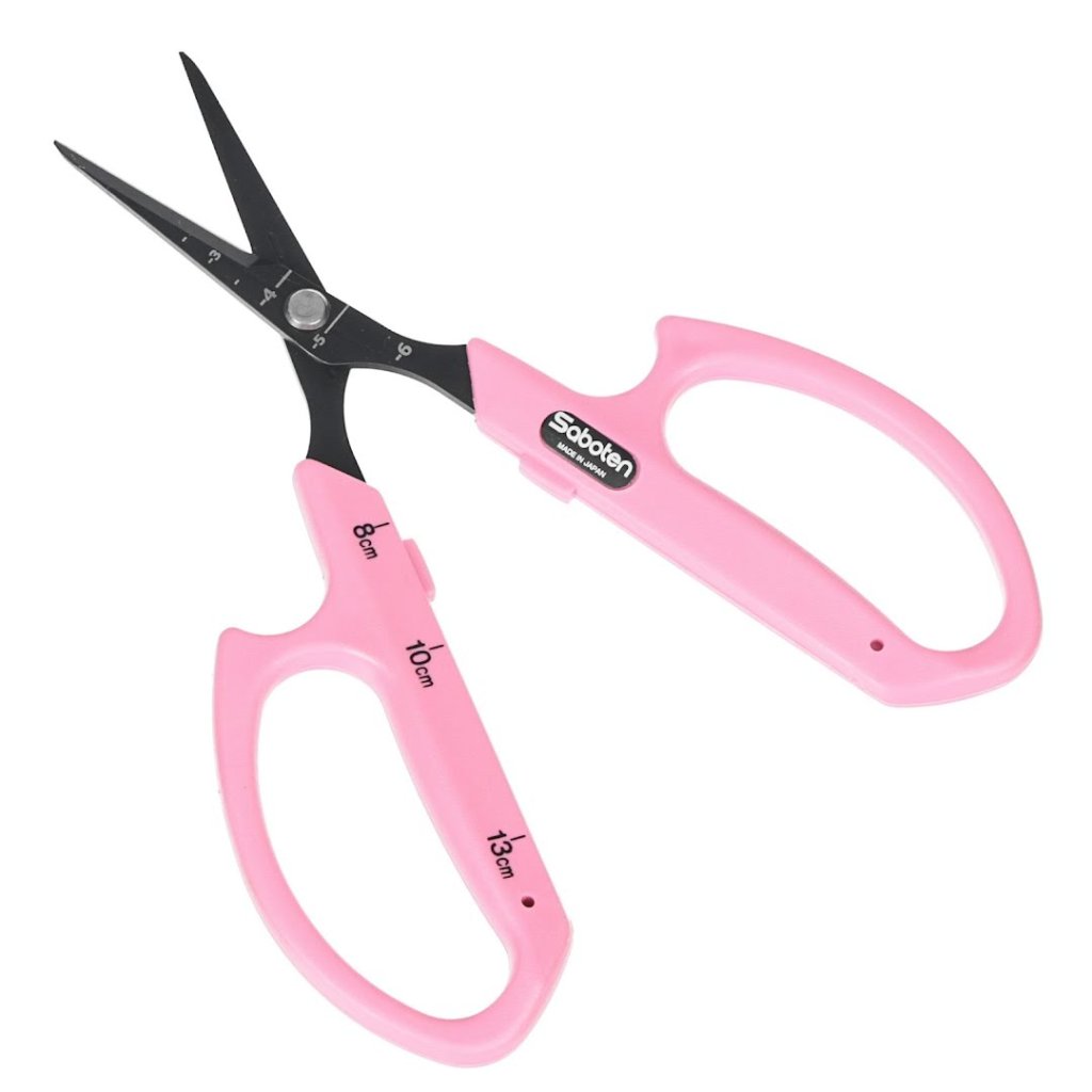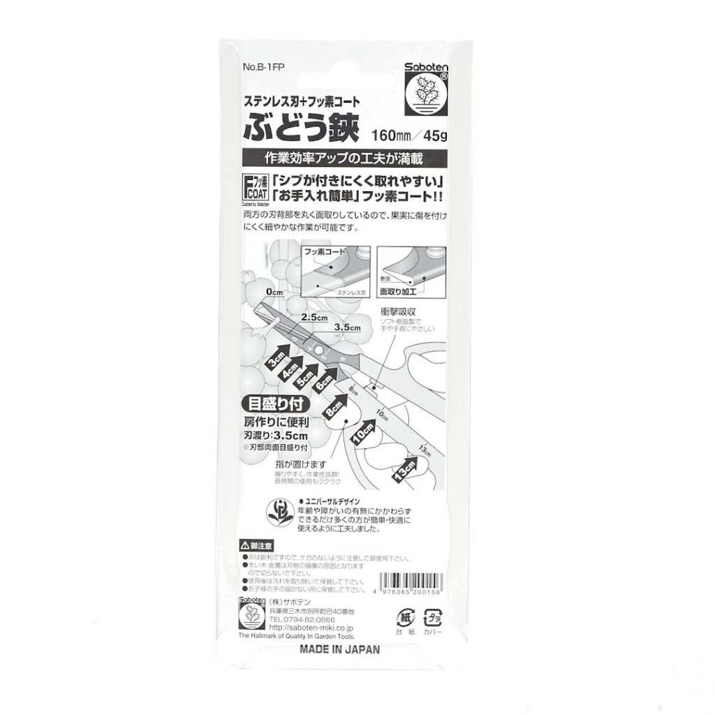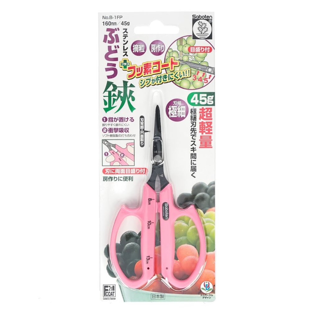 Japonské nůžky SABOTEN, model B-1FP, jsou odborně navrženy pro přesné prořezávání hroznů. Nůžky váží pouze 45 g a jsou vybaveny čepelemi z nerezové oceli s fluorovou povrchovou úpravou, které odolávají usazování šťávy. Rukojeti, vyrobené z měkké pryskyřice, účinně absorbují nárazy a snižují tak zátěž na vaše ruce a zápěstí. Navíc mají čepele zaoblený hřbet, aby se minimalizovalo riziko poškození ovoce.