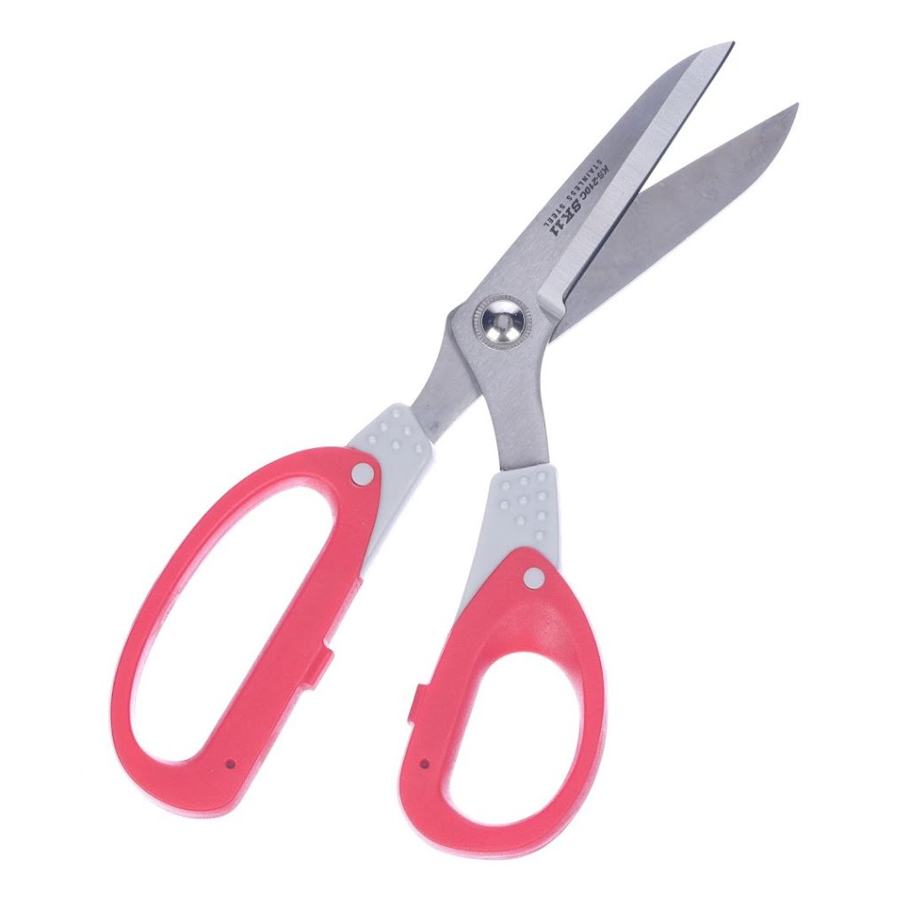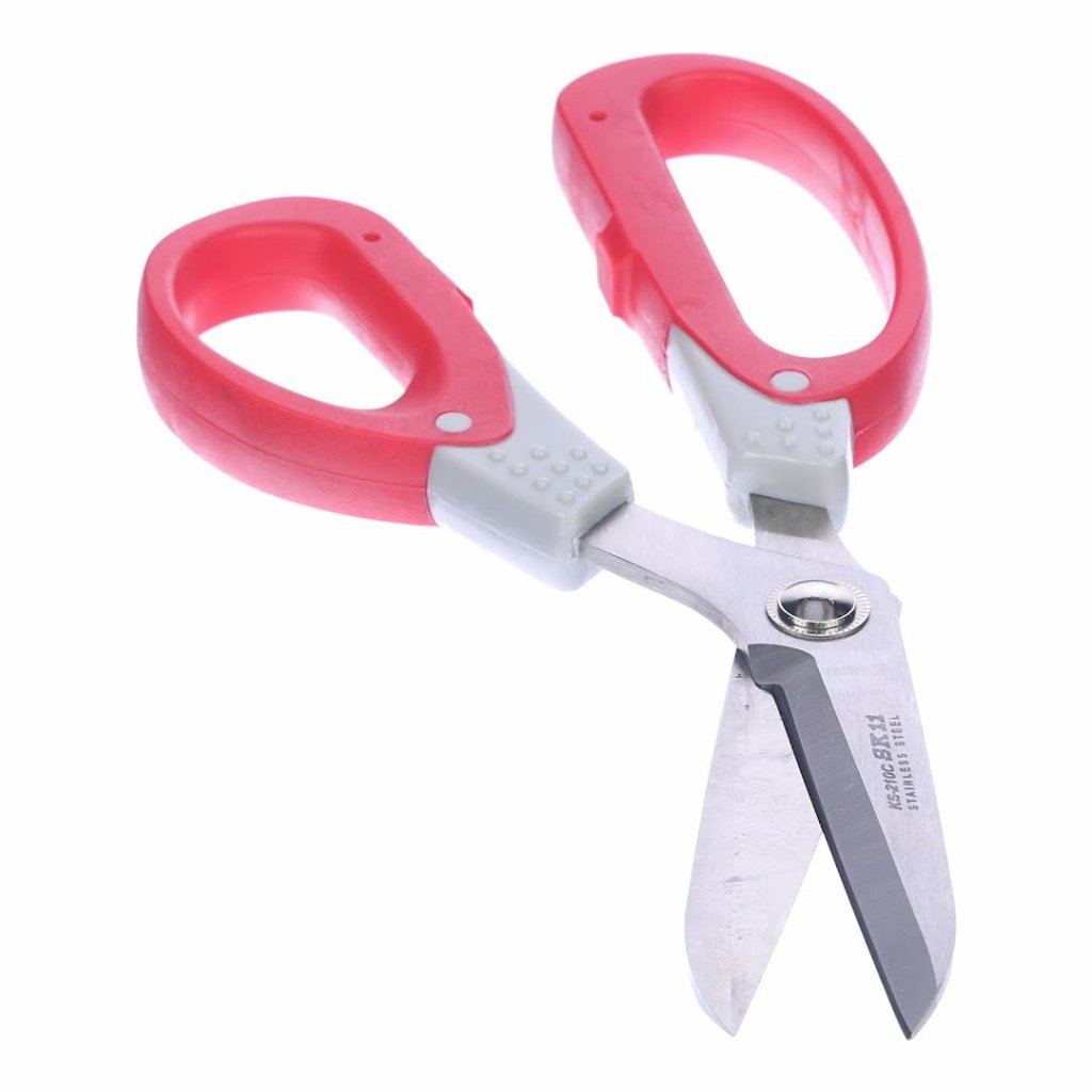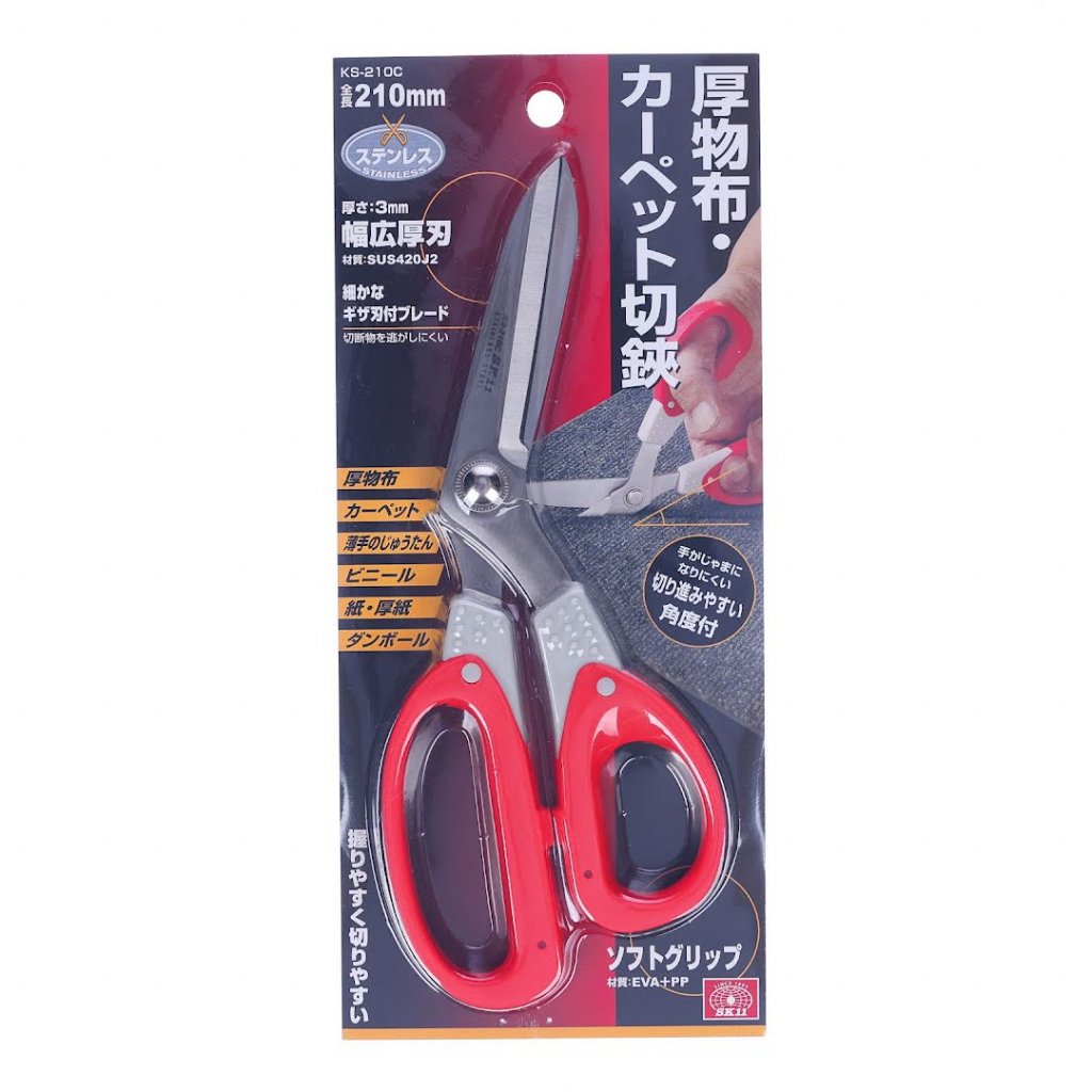 Nůžky SK11, model KS-210C, jsou navrženy pro přesné a snadné stříhání silných látek a koberců. Mají zahnutou rukojeť pro lepší manévrovatelnost a zabránění překážení ruky. Nůžky mají 3 mm širokou čepel, která zajišťuje odolnost a sílu pro stříhání hustých materiálů, jako jsou těžké látky, koberce a papír. Přidání jemně zoubkovaných okrajů na jedné straně čepele zabraňují sklouznutí a zajišťuje pevný úchop na kluzkých materiálech. Ideální pro materiály jako akryl a polyester, efektivně stříhá obecné rohože a koberce s podložkou až do 1,5 mm a výškou vlasu přibližně 20 mm.