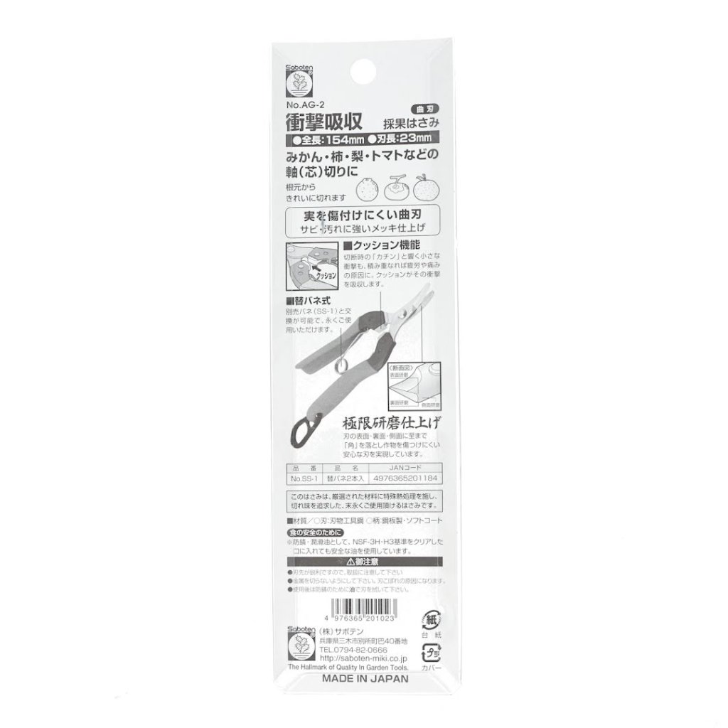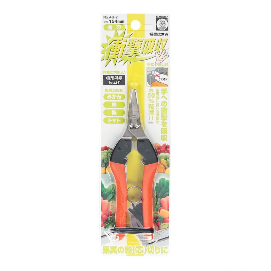 Japonské nůžky na ovoce SABOTEN, model No.AG-2 jsou navrženy pro efektivní sklizeň ovoce a zeleniny jako pomeranče, tomel, hrušky a rajčata. Tyto nůžky mají přesně broušené čepele, které minimalizují poškození vaší úrody. Rukojeti pohlcující nárazy snižují únavu rukou přibližně o 50%. Kalibrované chromované čepele poskytují vynikající řezný výkon a odolnost proti rzi a pryskyřici.