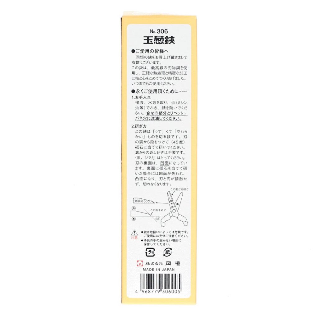 Japonské nůžky OKATSUNE, model č.306, jsou odborně navrženy pro preciznost a efektivitu. Jsou výslovně určeny pro stříhání měkkých kořenů cibule a podobných materiálů. Nůžky jsou vyrobeny z prémiové oceli , která zajišťuje dlouhotrvající ostrost a odolnost. S celkovou délkou 195 mm a hmotností 115 g nabízejí vynikající ovladatelnost a pohodlí.
