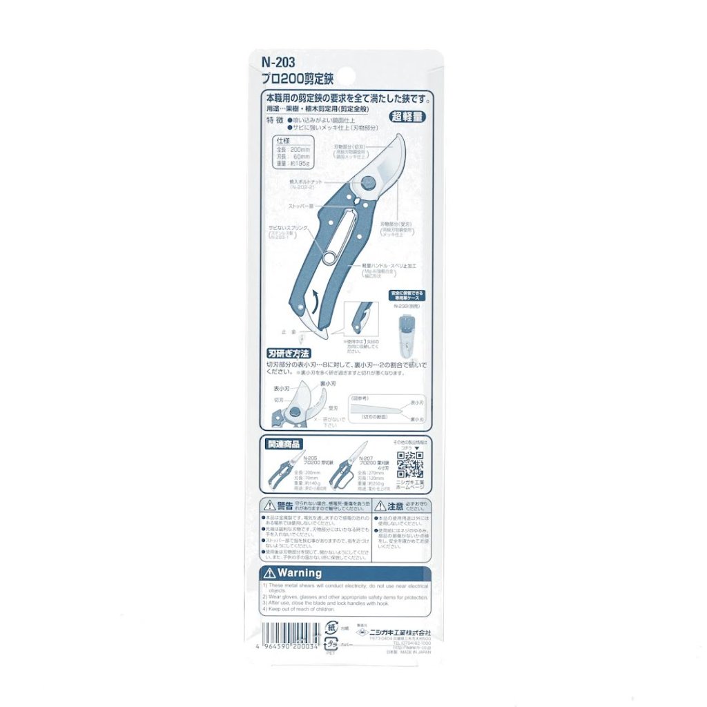 Tyto zahradnické nůžky NISHIGAKI, model N-203, jsou navrženy tak, aby splnily všechny potřeby profesionálního střihu. Nůžky mají lehké hliníkové rukojeti s protiskluzovým úchopem. Čepele jsou potaženy tvrdým chromem, aby odolaly pryskyřici a rzi, nabízejí vynikající sílu a snadné čištění. Zrcadlově leštěná hrana zajišťuje hladký a přesný střih, zatímco drážka na přijímací čepeli snižuje hromadění pryskyřice pro hladký chod. Jsou ideální pro stříhání zahradních a ovocných stromů. Tyto nůžky jsou 200 mm dlouhé a váží přibližně 195 g.
