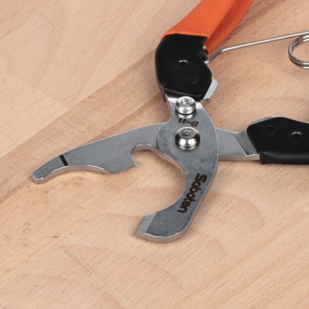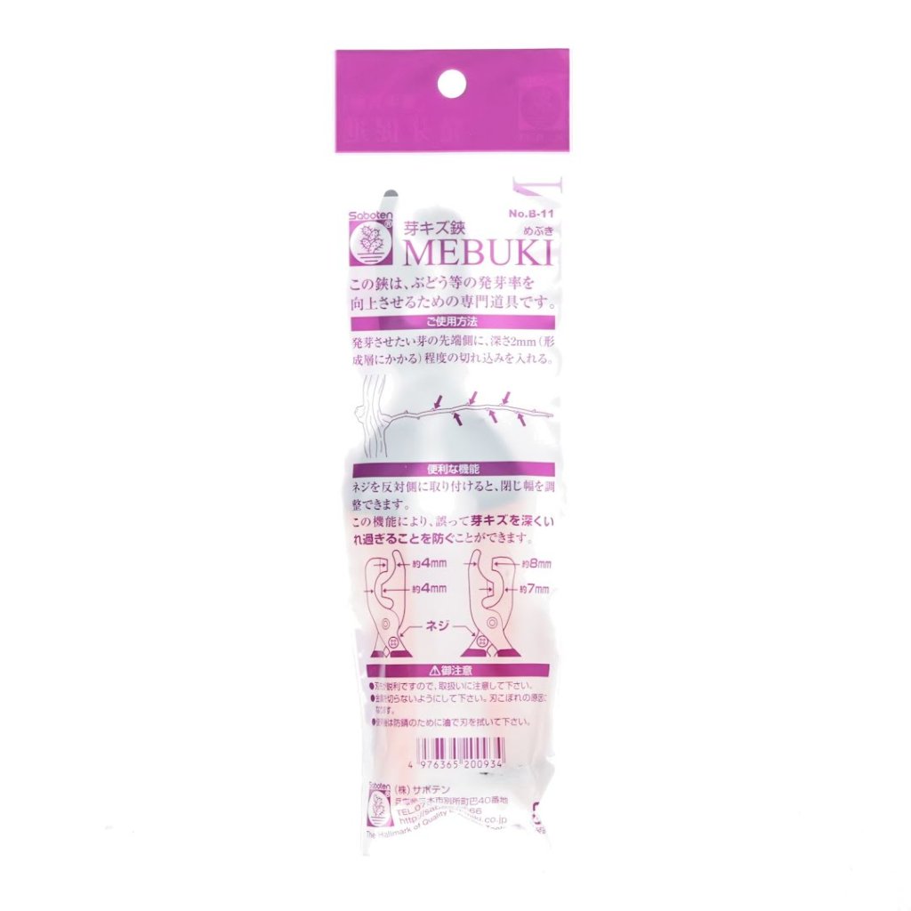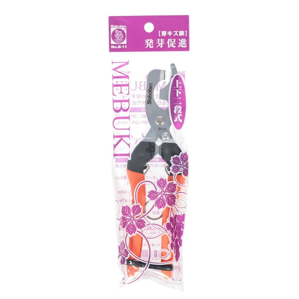 Zahradnické nůžky SABOTEN, model No.B-11, jsou navrženy k podpoře klíčení přesnými řezy na větvích rostlin. Díky dvojitým čepelím umožňují provádět řezy na obou stranách větve, aniž by bylo nutné přemístit ruku. Nůžky také obsahují nastavitelný šroub, který vám umožní ovládat šířku řezu. S hloubkou řezu v rozmezí od 4 do 8 mm jsou ideální pro podporu klíčení v cílených oblastech. S hmotností přibližně 122 g jsou tyto nůžky lehké a snadno ovladatelné.