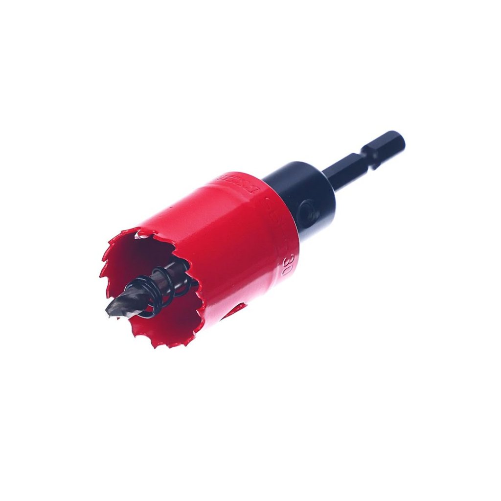 Bimetalový vykružovací vrták SK11, model SBH-30 je navržen pro efektivní vrtání do různých materiálů, včetně dřeva, PVC a sádrokartonu. Tato 30 mm korunka disponuje břitem z rychlořezné oceli M42 s kobaltem pro výjimečný řezný výkon a odolnost. Její tenký břit 0,8 mm snižuje odpor při řezání, což umožňuje rychlejší vrtání. Navíc pružina středového vrtáku usnadňuje odstranění odpadu po vrtání, čímž zvyšuje celkovou efektivitu. Je vhodná pro použití s elektrickými vrtačkami pracujícími při 600-1200 ot./min.