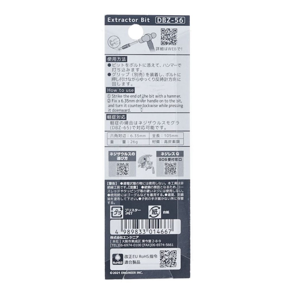 Náhradní bit ENGINEER, model DBZ-56, je specializovaný nástroj pro odstranění poškozených šroubů. Navržen pro šrouby s 5,0 mm vnitřním šestihranem, tento bit je ideální pro vytahování šroubů s strženým nebo deformovaným vnitřním šestihranem. S délkou 105 mm a hmotností 26g nabízí přesnost a odolnost. Je to neizolovaný nástroj a neměl by být používán na živých elektrických vodičích